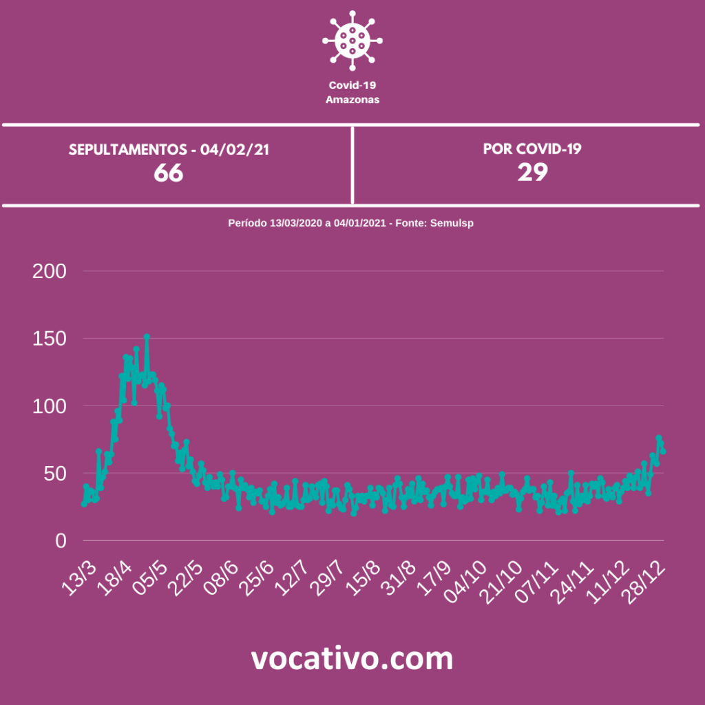 A Prefeitura de Manaus informa que um total de 66 sepultamentos foi registrado nos cemitérios da capital do Amazonas nesta segunda-feira, 4/1. Desses, 52 foram nos espaços gerenciados pela Secretaria Municipal de Limpeza Urbana (Semulsp), sem opção por cremação e dois óbitos oriundos de outras cidades. Já nos cemitérios particulares, 14 enterros foram realizados.