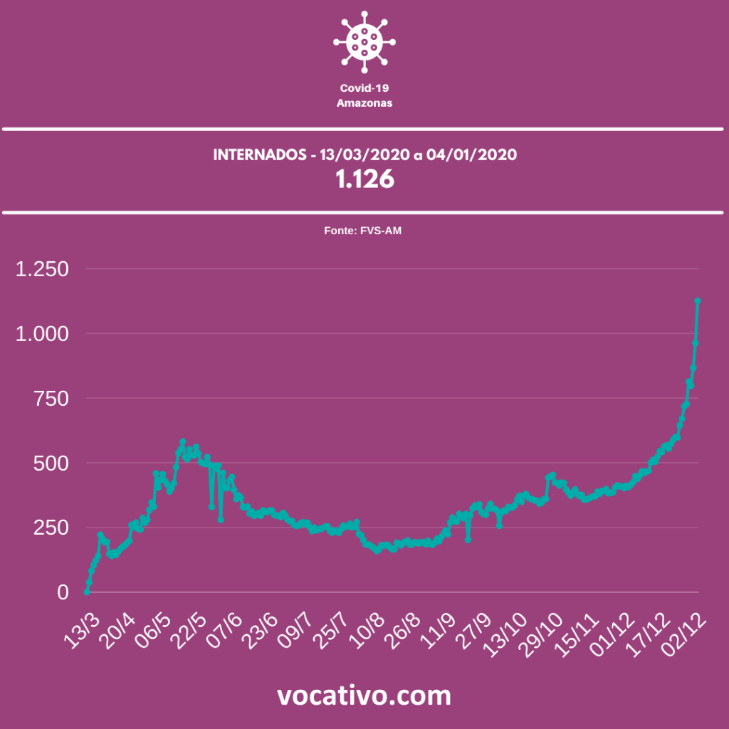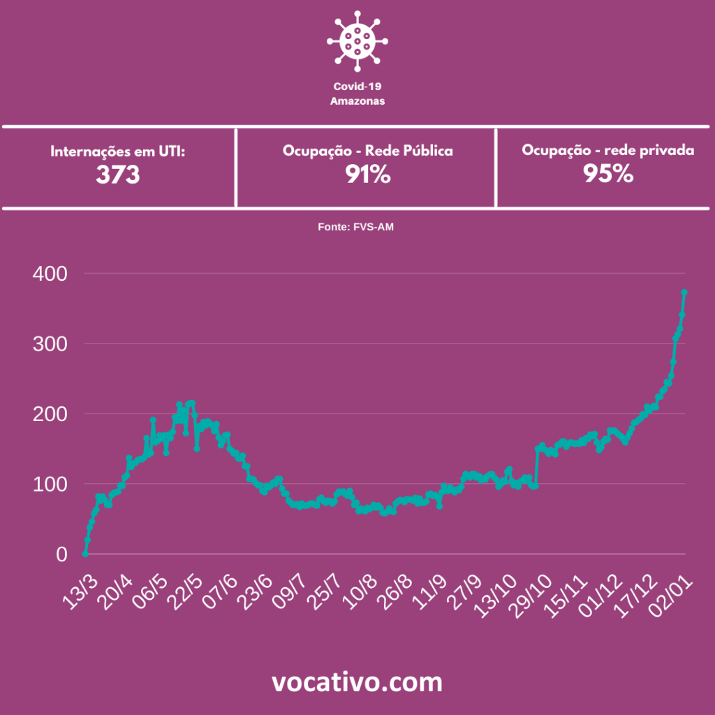 Entre os casos confirmados de Covid-19 no Amazonas, há 1.126 pacientes internados, sendo 735 em leitos (242 na rede privada e 484 na rede pública), 373 em UTI (129 na rede privada e 240 na rede pública). Atualmente, a taxa de ocupação de leitos de UTI em todo o estado é de 92%, sendo 91% na rede pública e 95% na rede particular.