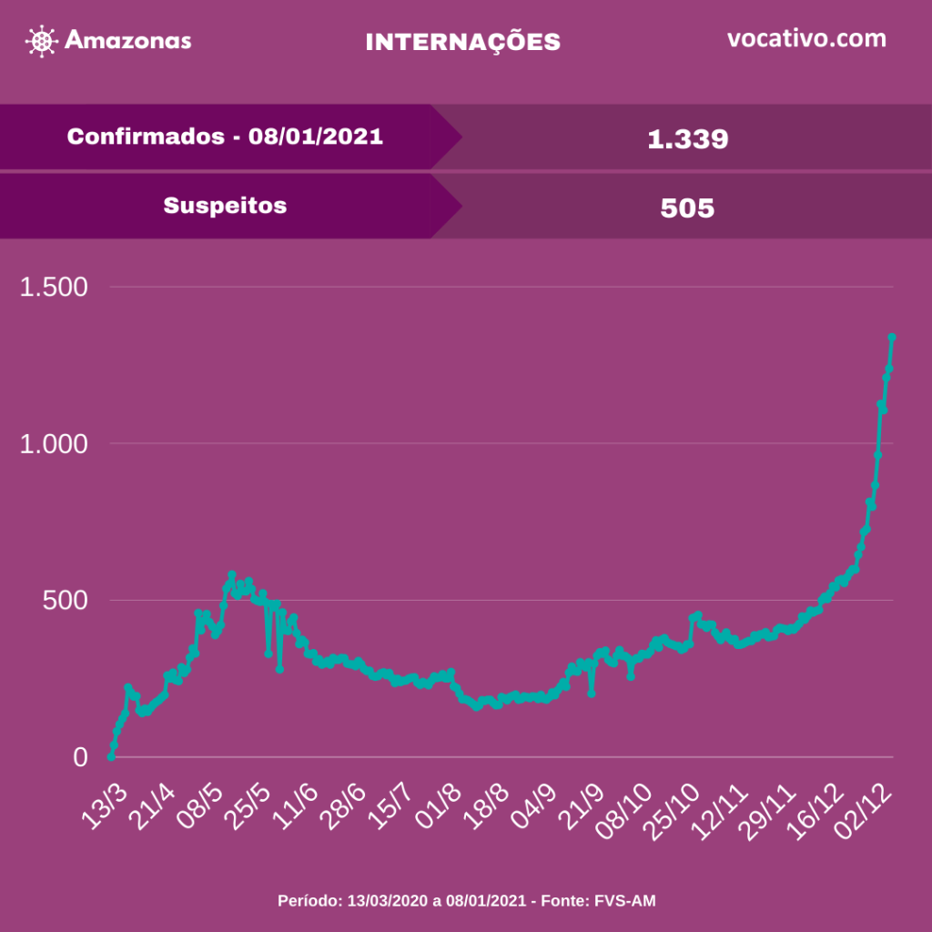 Entre os casos confirmados de Covid-19 no Amazonas, há 1.339 pacientes internados, sendo 859 em leitos (322 na rede privada e 537 na rede pública), 421 em UTI (142 na rede privada e 279 na rede pública). A taxa de ocupação de leitos de UTI em todo o estado está perto do colapso, operando a 93% de capacidade, sendo 95% na rede pública e 91% na rede particular.