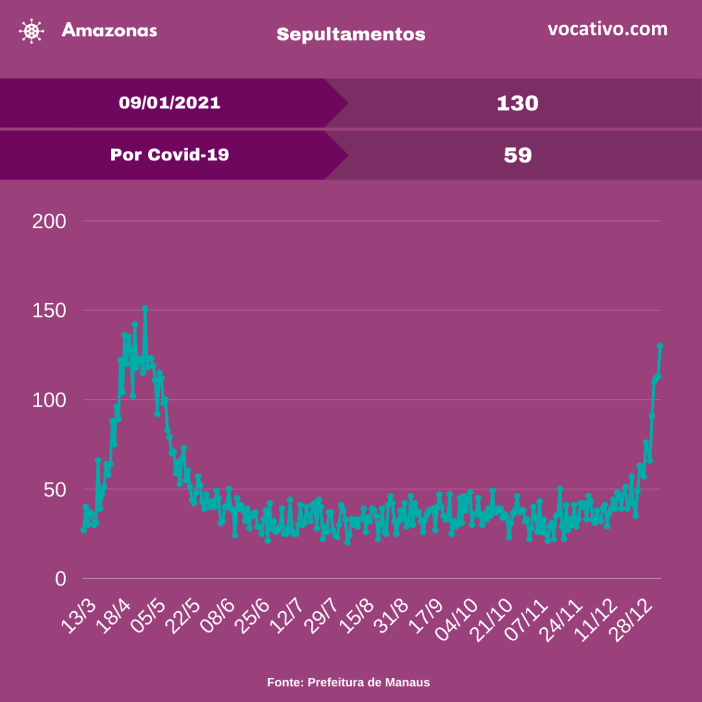A Prefeitura de Manaus informa que um total de 130 sepultamentos foram registrados nos cemitérios de Manaus neste sábado. Entre as causas das mortes do total de sepultamentos nos cemitérios públicos da capital do Amazonas, 45 foram declaradas como Covid-19 e nos espaços privados foram 14 registros de óbitos pelo novo coronavírus.