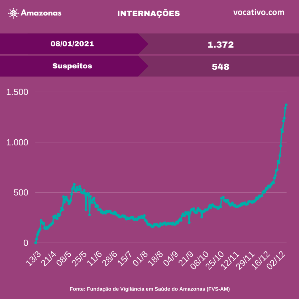 Entre os casos confirmados de Covid-19 no Amazonas, há 1.372 pacientes internados, sendo 905 em leitos (357 na rede privada e 548 na rede pública), 431 em UTI (150 na rede privada e 281 na rede pública). A taxa de ocupação de leitos de UTI até o momento é de 90% em todo o estado, sendo 88% na rede pública e 92% na rede privada.