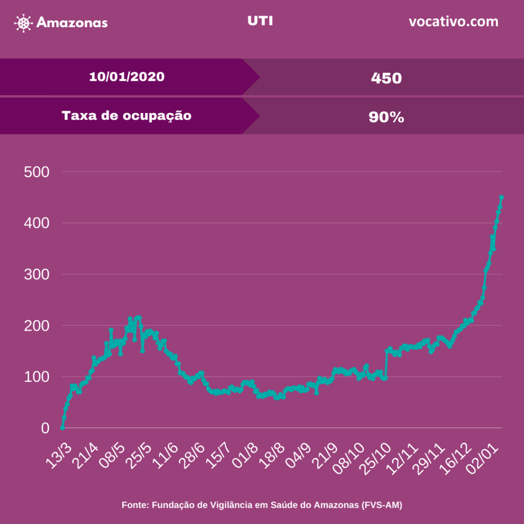 Entre os casos confirmados de Covid-19 no Amazonas, há 1.450 pacientes internados, sendo 973 em leitos (367 na rede privada e 606 na rede pública), 450 em UTI (167 na rede privada e 283 na rede pública). A taxa de ocupação de leitos de UTI no estado é de 89%, sendo 90% na rede pública e 87% na rede particular. Há ainda 417 pacientes internados são considerados suspeitos e aguardam a confirmação do diagnóstico.