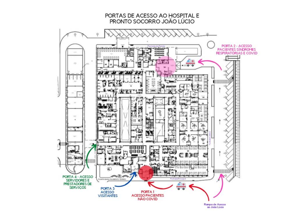 Porta 2 – Acesso de Pacientes Covid-19 e Síndrome Respiratória: ao entrar no portão principal do HPS João Lucio, seguir em frente até a entrada dos fundos da unidade, onde já funciona a entrada da urgência e emergência.