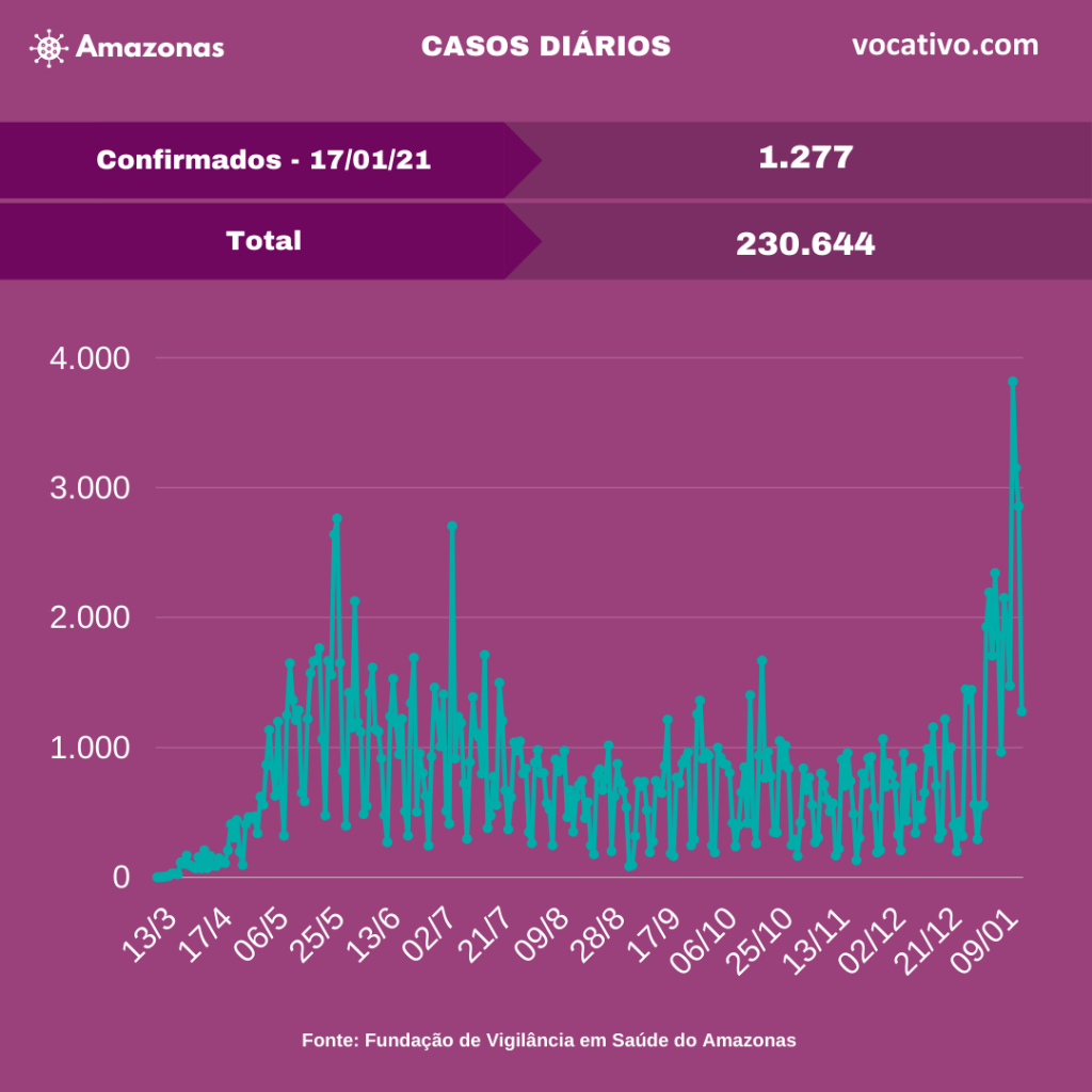 A Fundação de Vigilância em Saúde do Amazonas confirmou neste domingo (17/01) o diagnóstico de 1.277 novos casos de Covid-19, totalizando 230.644 casos da doença no estado, sendo 98.393 são em Manaus (42,66%) e 132.251 do interior do estado (57,34%).