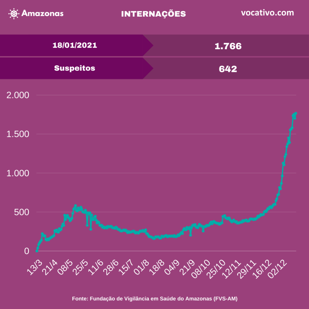 Internações – Entre os casos confirmados de Covid-19 no Amazonas, há 1.766 pacientes internados, sendo 1.144 em leitos (475 na rede privada e 669 na rede pública) e 598 em UTI (284 na rede privada e 314 na rede pública). A taxa de ocupação de leitos de terapia intensiva é de 98%, tanto na rede pública quanto na particular. Há ainda outros 642 pacientes internados considerados suspeitos.