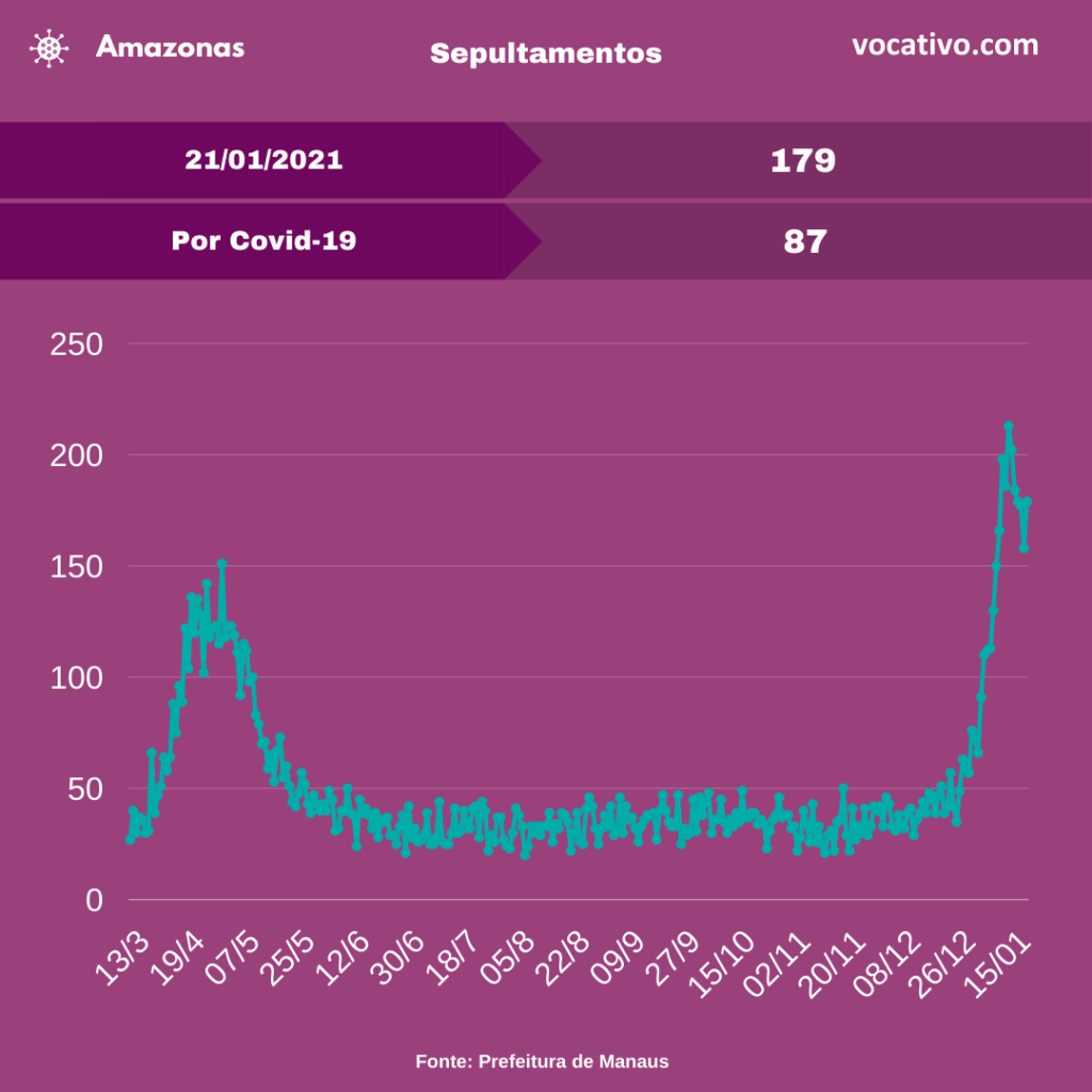 Óbitos – De acordo com o boletim, foram confirmados 159 óbitos por Covid-19, sendo 67 ocorridos no dia 20/01 e 92 óbitos foram encerrados por critérios clínicos, elevando para 6.757 o total de mortes, sendo 4.502 óbitos de Manaus e 2.255 no interior. Na capital, de acordo com dados da Prefeitura de Manaus, nesta quarta-feira (20/01), foram registrados 179 sepultamentos, sendo 87 por Covid-19.