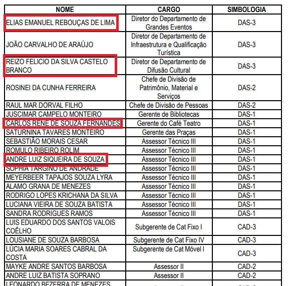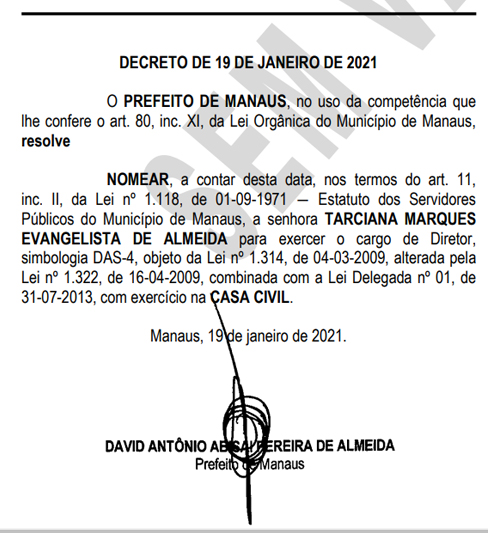 Tarciana foi nomeada diretora na Casa Civil. Já para a Fundação Municipal de Cultura, Turismo e Eventos (Manauscult) foram escolhidos o ex-vereador Alonso Oliveira (Avante), que Elias Emanuel (PSDB – será diretor do Departamento de Grandes Eventos), Reizo Castelo Branco (PTB – diretor do Departamento de Difusão Cultural), André Luiz (PL) e Carlos Porta (PSB). Todos foram derrotados nas eleições de 2020.
