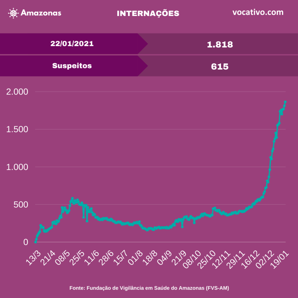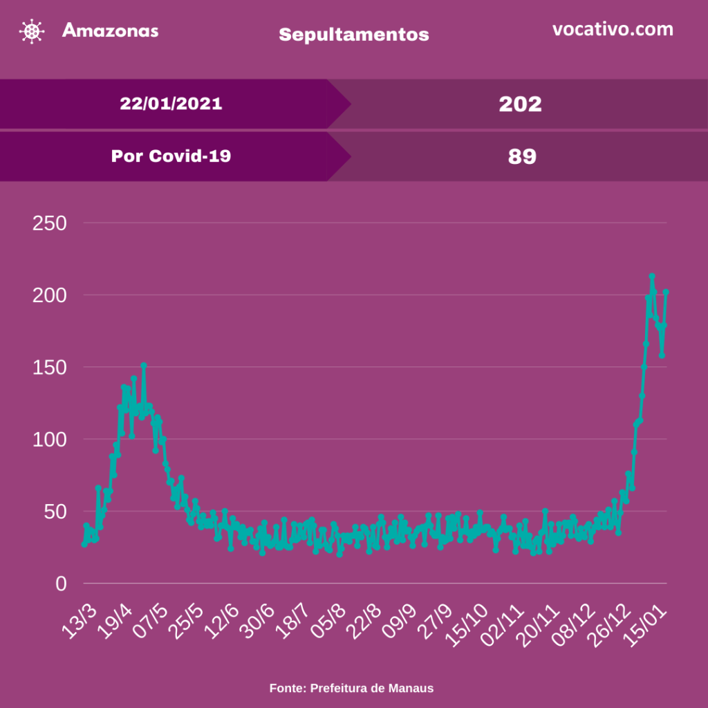 Óbitos – Segundo o boletim, foram confirmados 132 óbitos por Covid-19, sendo 83 ocorridos no dia 21/01 e 49 óbitos foram encerrados por critérios clínicos, elevando para 6.889 o total de mortes (4.617 óbitos em Manaus e 2.272 no interior). Na capital, de acordo com dados da Prefeitura de Manaus, nesta quinta foram registrados 202 sepultamentos, sendo 89 por Covid-19.