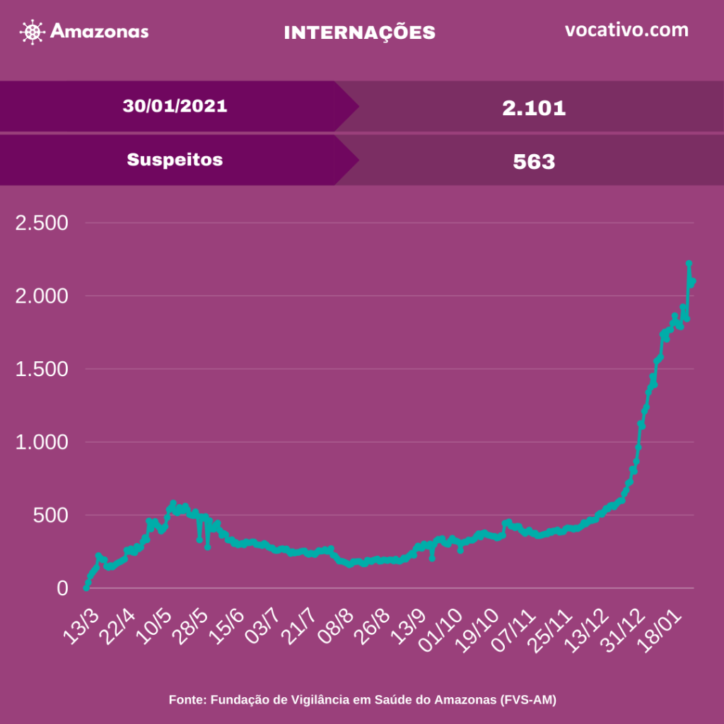 Óbitos – Segundo o boletim, foram confirmados 225 óbitos por Covid-19, sendo 76 ocorridos no dia 29/01 e 149 óbitos foram encerrados por critérios clínicos, de imagem, clínico-epidemiológico ou laboratorial, elevando para 8.018 o total de mortes (5.490 óbitos em Manaus e 2.528 no interior). Na capital, de acordo com dados da Prefeitura de Manaus, foram registrados 150 sepultamentos, sendo 80 por Covid-19.