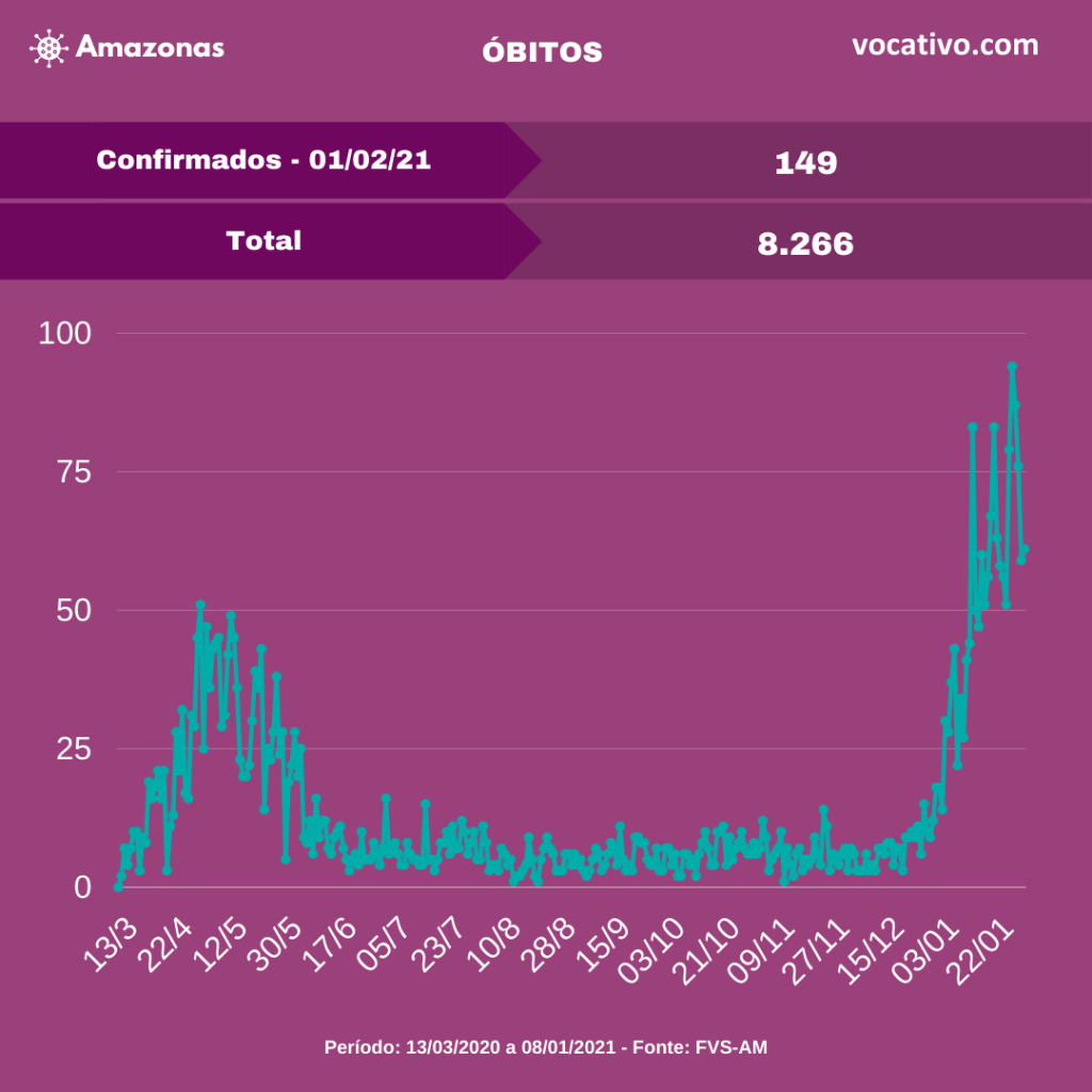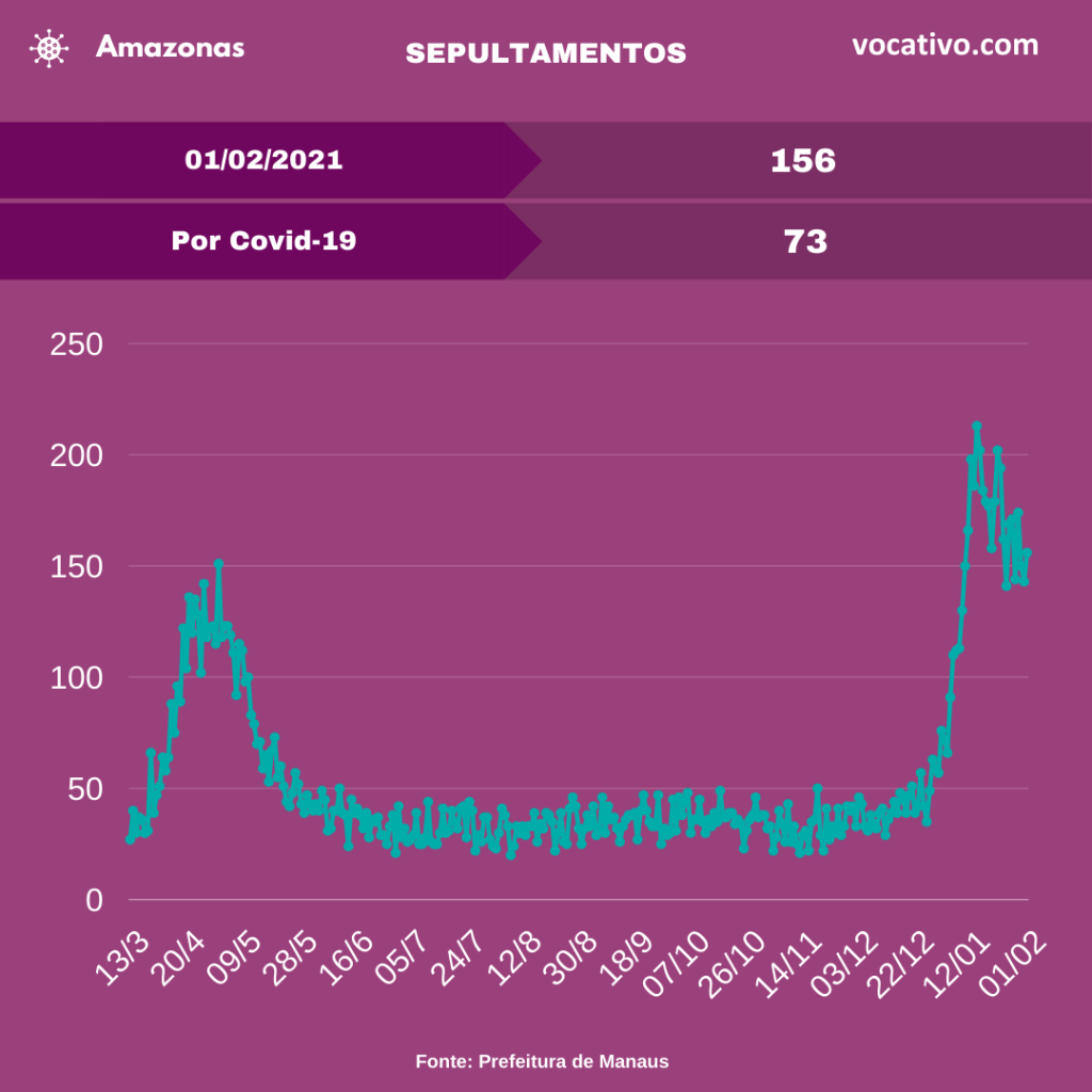 Óbitos – Foram confirmados 149 óbitos por Covid-19, sendo 61 ocorridos no dia 31/01 e 88 óbitos foram encerrados por critérios clínicos, elevando para 8.266 o total de mortes (5.693 em Manaus e 2.573 no interior). A Prefeitura de Manaus contabilizou 156 sepultamentos nos cemitérios da capital nesta segunda-feira, sendo 73 confirmados por Covid-19.