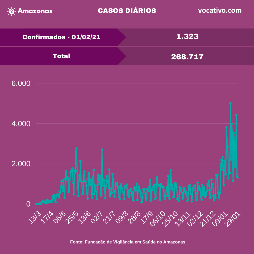 A Fundação de Vigilância em Saúde do Amazonas (FVS-AM) confirmou nesta segunda-feira (01/02) o diagnóstico de 1.323 novos casos de Covid-19, totalizando 268.717 casos da doença no estado. Do total, 120.954 são de Manaus (45,01%) e 147.763 do interior do estado (54,99%).