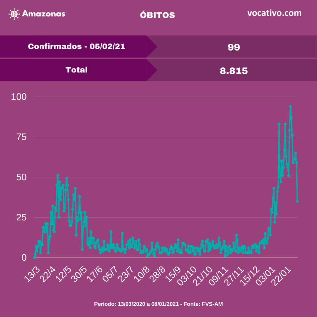 Óbitos – Também foram confirmados 99 óbitos por Covid-19, sendo 35 ocorridos no dia 04/02 e 64 óbitos foram encerrados por critérios clínicos, elevando para 8.815 o total de mortes (6.119 em Manaus e 2.696 no interior). A Prefeitura de Manaus, por sua vez, contabilizou 125 sepultamentos nos cemitérios da capital nesta sexta, sendo 58 com diagnóstico confirmado por Covid-19.