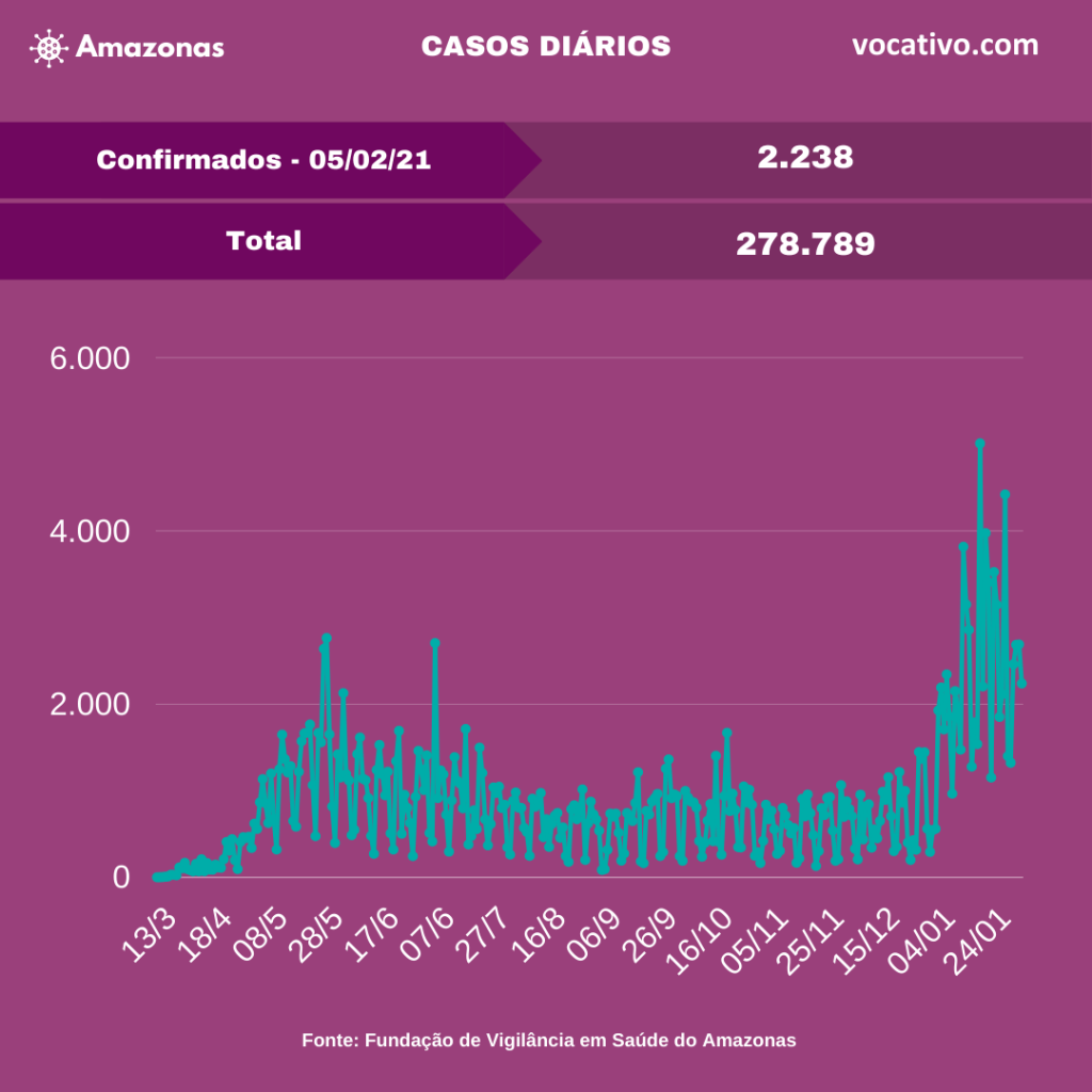 A Fundação de Vigilância em Saúde do Amazonas (FVS-AM) confirmou nesta sexta-feira (05/02) o diagnóstico 2.238 novos casos de Covid-19, totalizando 278.789 casos da doença no Estado. Deste total, 126.396 casos são de Manaus (45,34%) e 152.393 do interior do estado (54,66%).