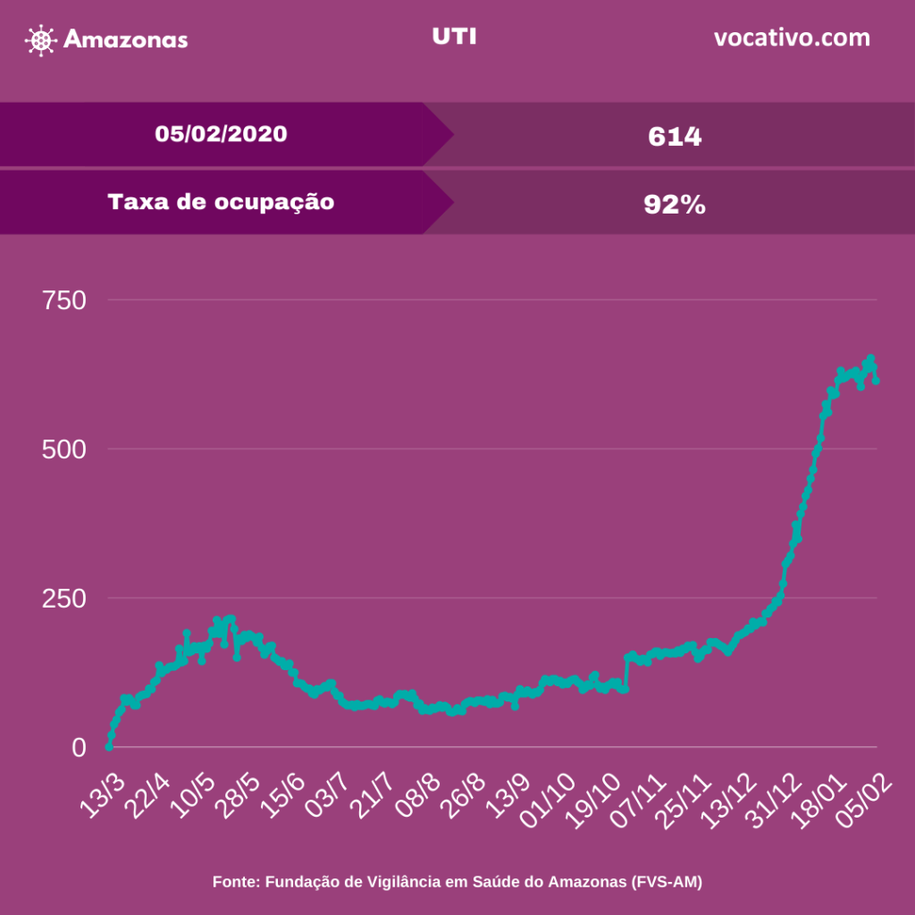 Internações – Entre os casos confirmados de Covid-19 no Amazonas, há 2.015 pacientes internados, sendo 1.335 em leitos clínicos (420 na rede privada e 915 na rede pública), 614 em UTI (289 na rede privada e 325 na rede pública) e 66 em sala vermelha. A taxa de ocupação de UTI’s atualmente é de 92%, sendo 94% na rede pública e 93% na rede particular. Há ainda outros 511 pacientes internados considerados suspeitos e que aguardam a confirmação do diagnóstico.