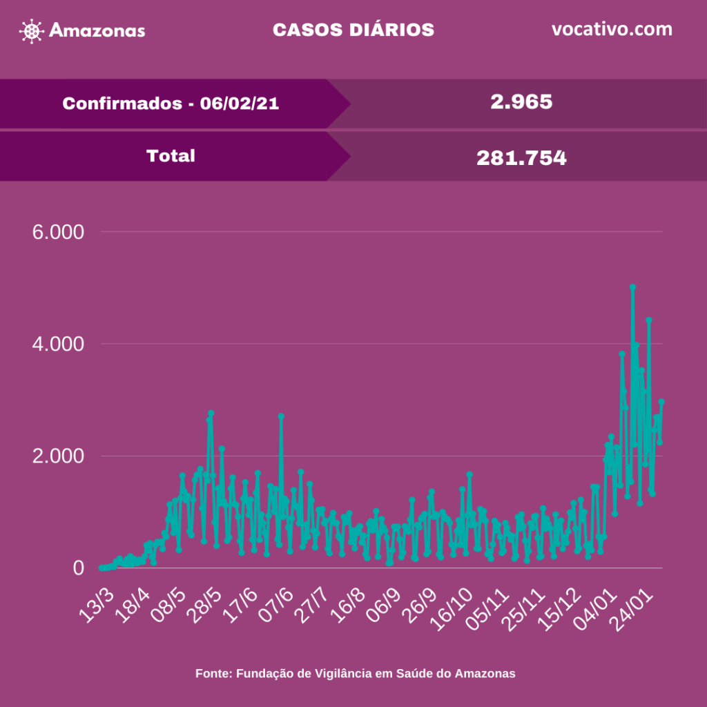 A Fundação de Vigilância em Saúde do Amazonas (FVS-AM) confirmou neste sábado (06/02) o diagnóstico de 2.965 novos casos de Covid-19, totalizando 281.754 casos da doença no estado. Deste total, 127.506 ocorrências são de Manaus (45,25%) e 154.248 do interior do estado (54,75%).