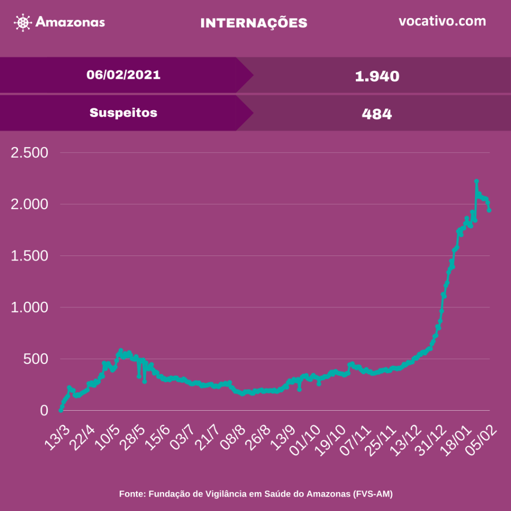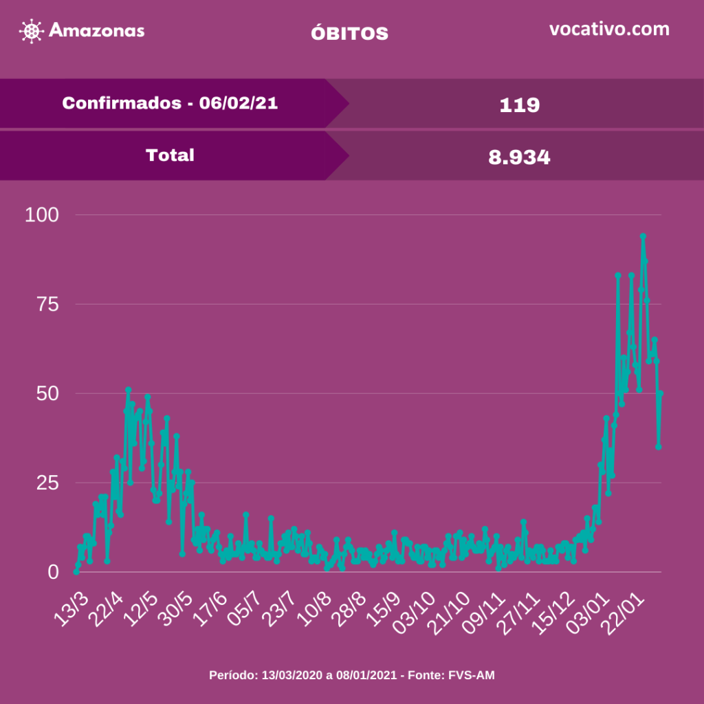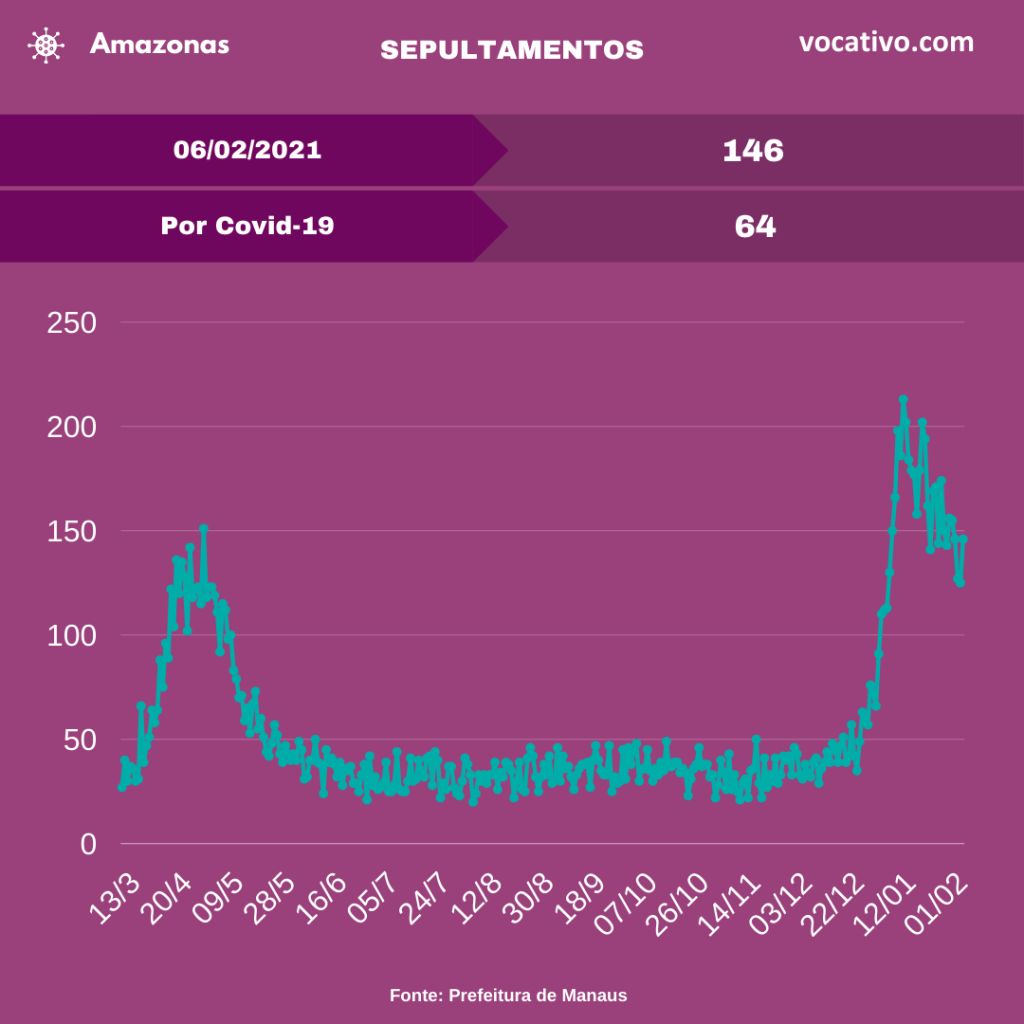 Óbitos – Segundo o boletim, foram confirmados 119 óbitos por Covid-19, sendo 50 ocorridos na sexta-feira (05/02) e 69 encerrados por critérios clínicos, elevando para 8.934 o total de mortes (6.208 na capital e 2.726 no interior). A Prefeitura de Manaus contabilizou 146 sepultamentos neste sábado, sendo 64 com diagnóstico confirmado para a Covid-19.