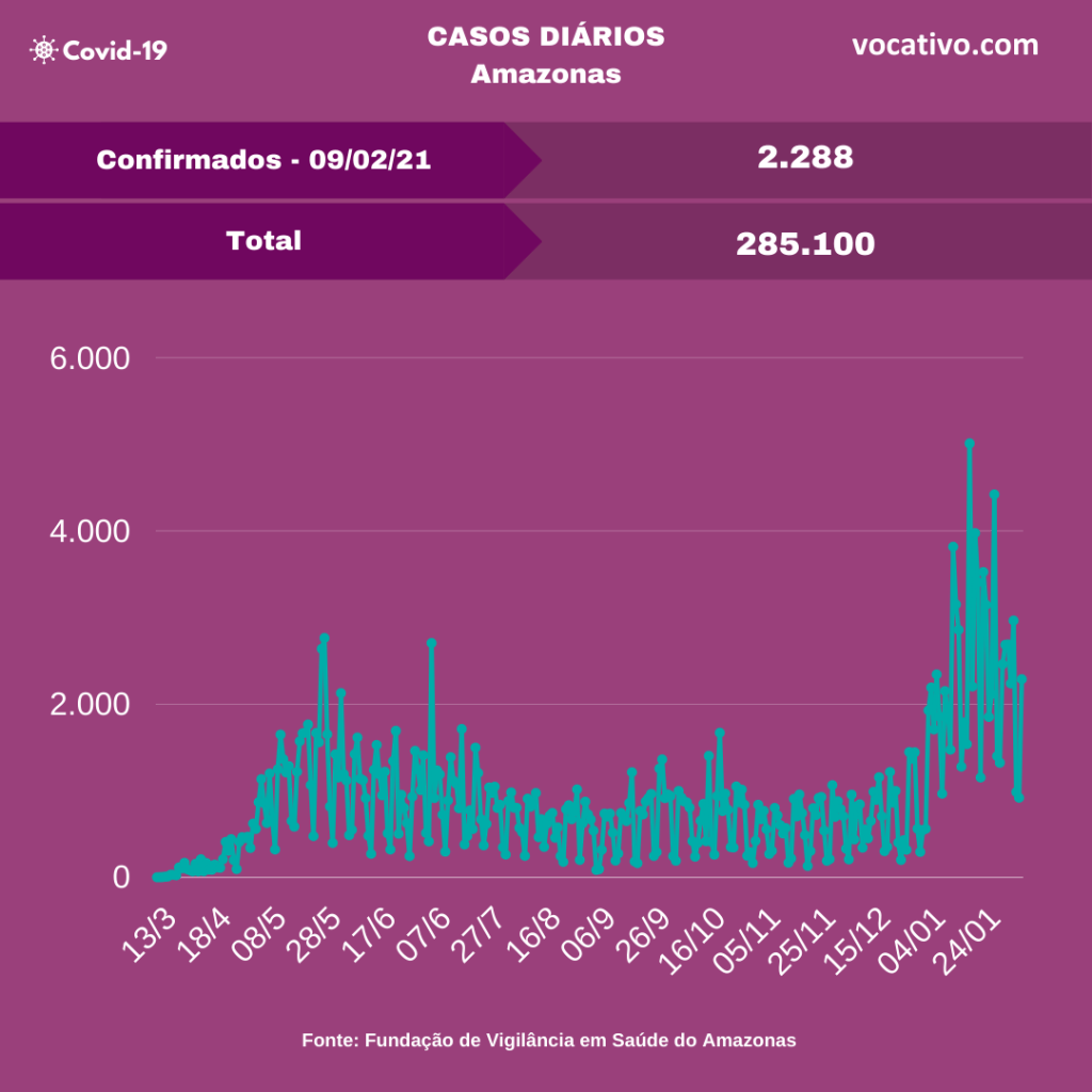 O Amazonas atingiu a marca de 285.100 casos de Covid-19 nesta terça-feira (09/02). De acordo com a Fundação de Vigilância em Saúde do Amazonas (FVS-AM), foram confirmados 2.288 novos casos da doença no estado. Do total, 129.721 casos são de Manaus (45,50%) e 155.379 do interior do estado (54,50%).