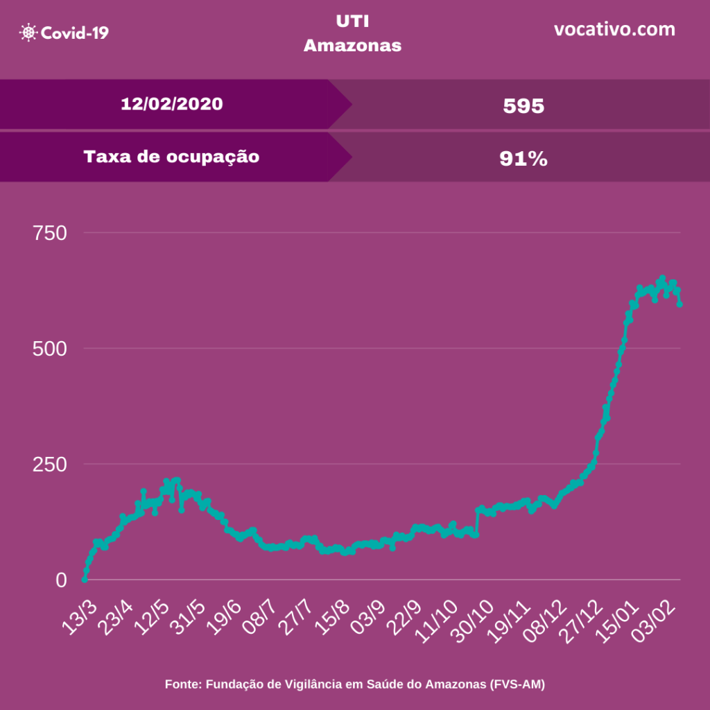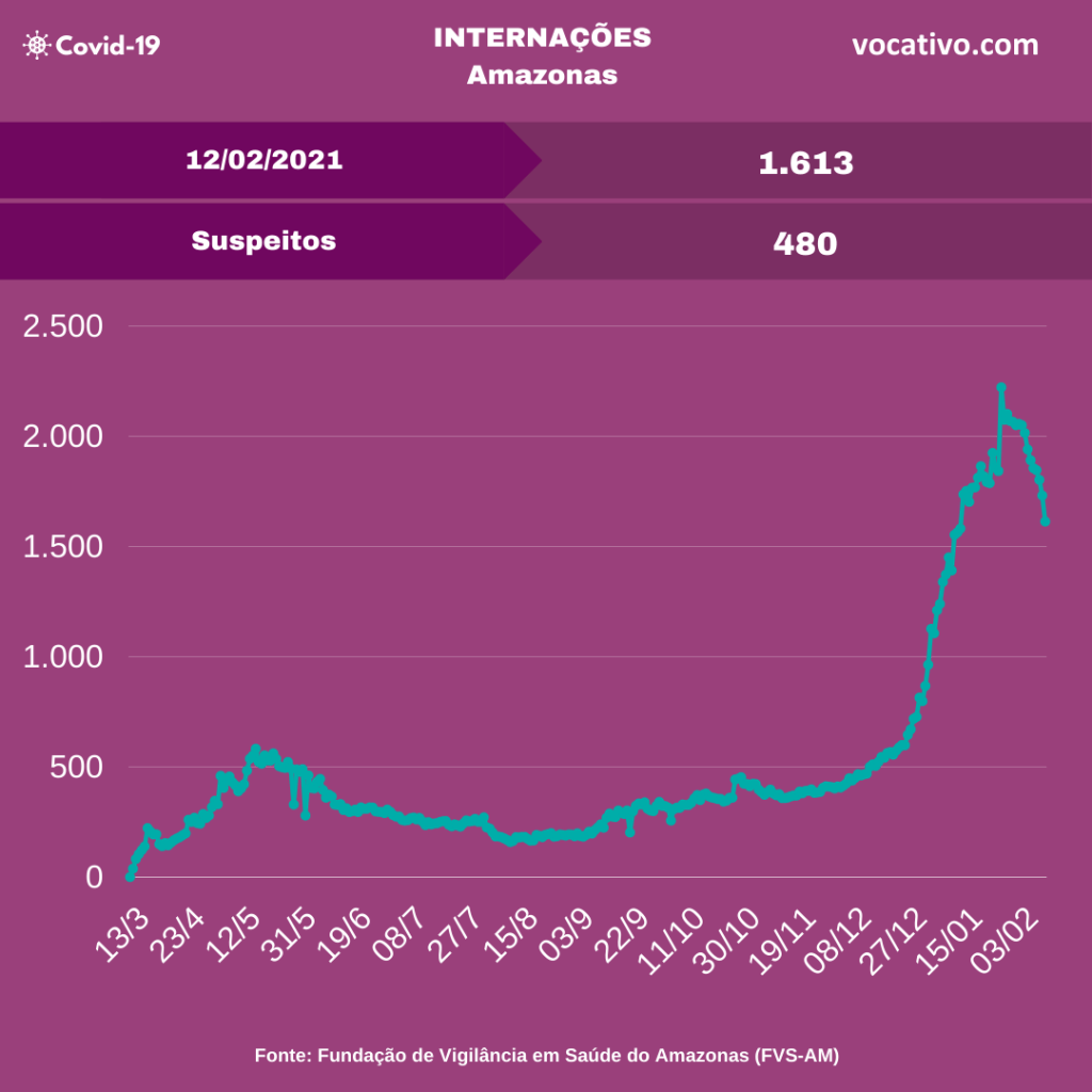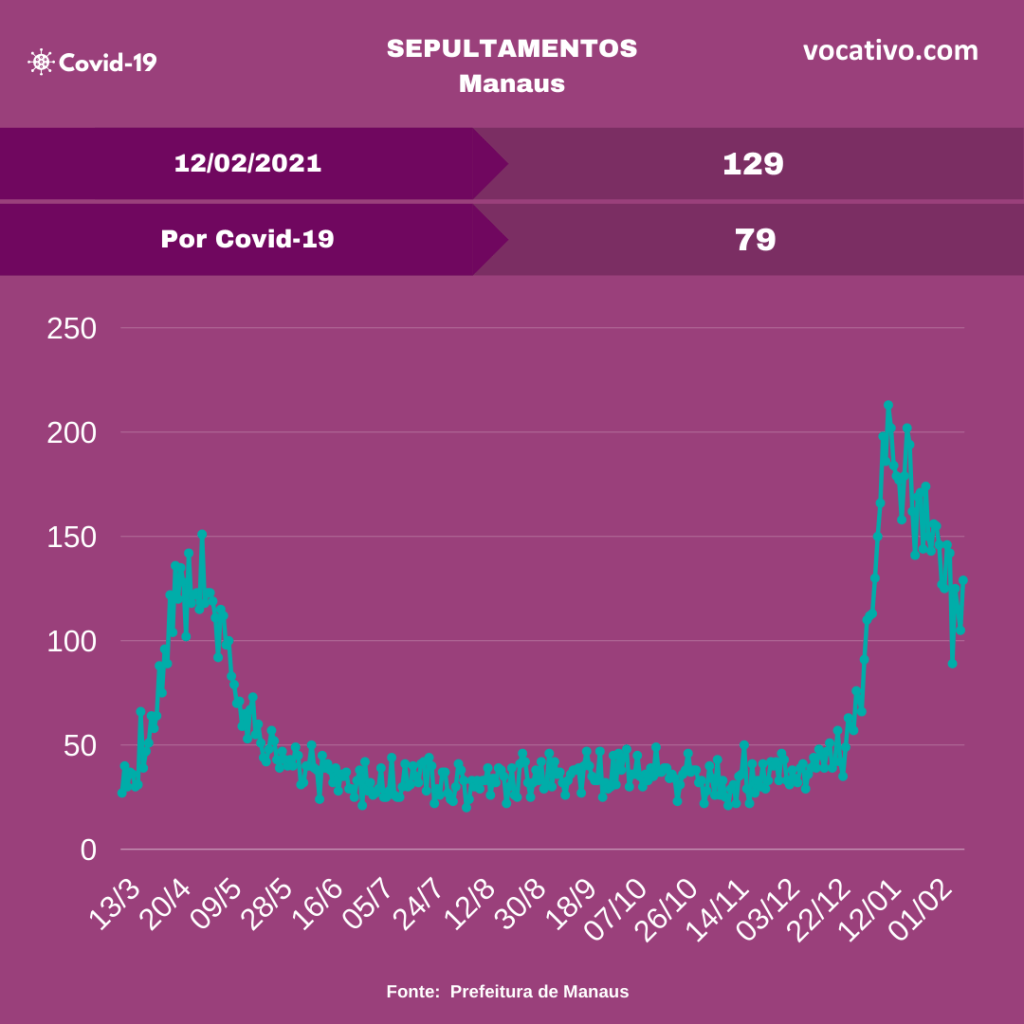 Óbitos – Foram confirmados 134 óbitos por Covid-19, sendo 42 ocorridos no dia 11/02 e 92 óbitos foram encerrados por critérios clínicos, elevando para 9.753 o total de mortes (6.872 em Manaus e 2.881 no interior). A Prefeitura de Manaus contabilizou 129 sepultamentos nesta sexta, sendo 79 declarados como Covid-19.