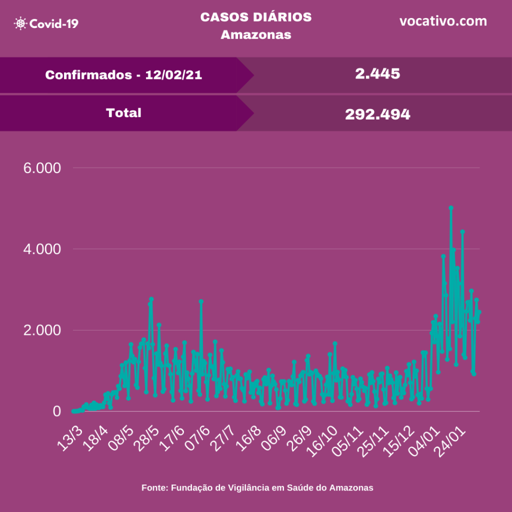 A Fundação de Vigilância em Saúde do Amazonas (FVS-AM) confirmou nesta sexta-feira (12/02) o diagnóstico 2.445 novos casos de Covid-19. Com isso, o total de casos da doença chegou a 292.494 em todo estado, sendo 134.182 em Manaus (45,88%) e 158.312 do interior do estado (54,12%).