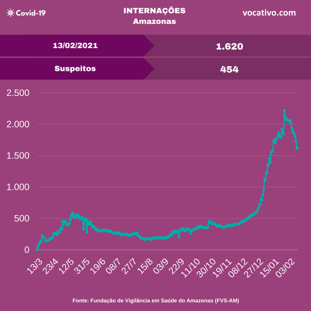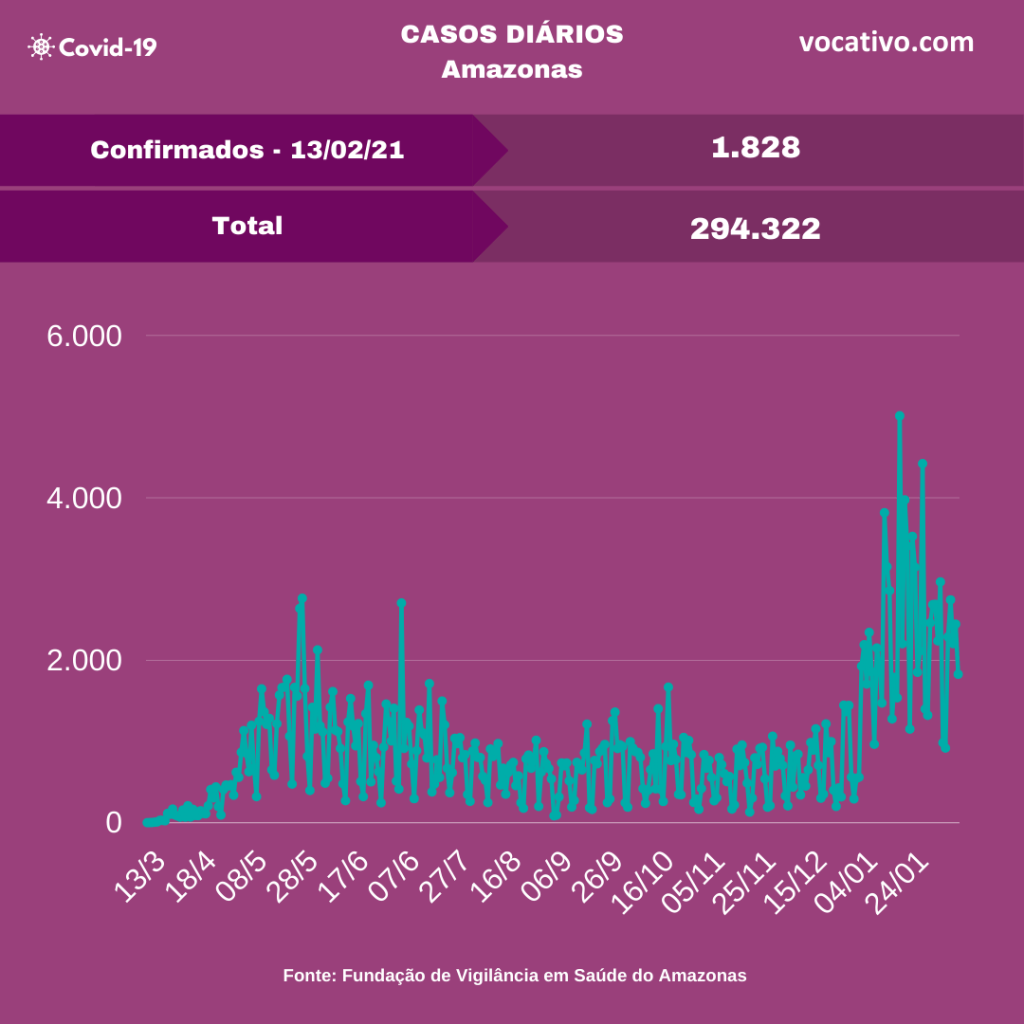 Óbitos – Foram confirmados 66 óbitos por Covid-19, sendo 34 ocorridos no dia 12/02 e 32 óbitos foram encerrados por critérios clínicos, elevando para 9.819 o total de mortes (6.920 em Manaus e 2.899 no interior do estado). A Prefeitura de Manaus contabilizou 95 sepultamentos nos cemitérios da capital neste sábado, sendo 51 declaradas como Covid-19.