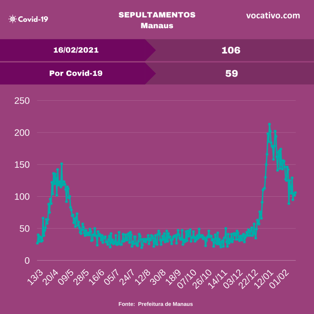 Óbitos – Foram confirmados 108 óbitos por Covid-19, sendo 55 ocorridos no dia 15/02 e 53 óbitos foram encerrados por critérios clínicos, de imagem, clínico-epidemiológico ou laboratorial, elevando para 10.100 o total de mortes (7.137 em Manaus e 2.963 no interior). A Prefeitura de Manaus registrou 106 sepultamentos nesta terça-feira, 59 pelo novo coronavírus.