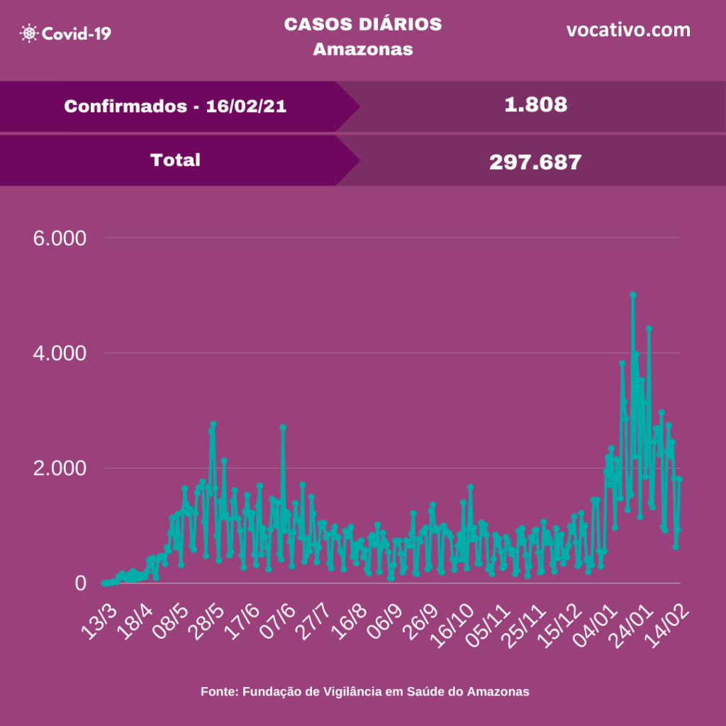 A Fundação de Vigilância em Saúde do Amazonas confirmou nesta terça-feira (16/02) 1.808 novos casos de Covid-19, totalizando 297.687 casos da doença no estado, sendo 136.890 de Manaus (45,98%) e 160.797 do interior (54,02%).