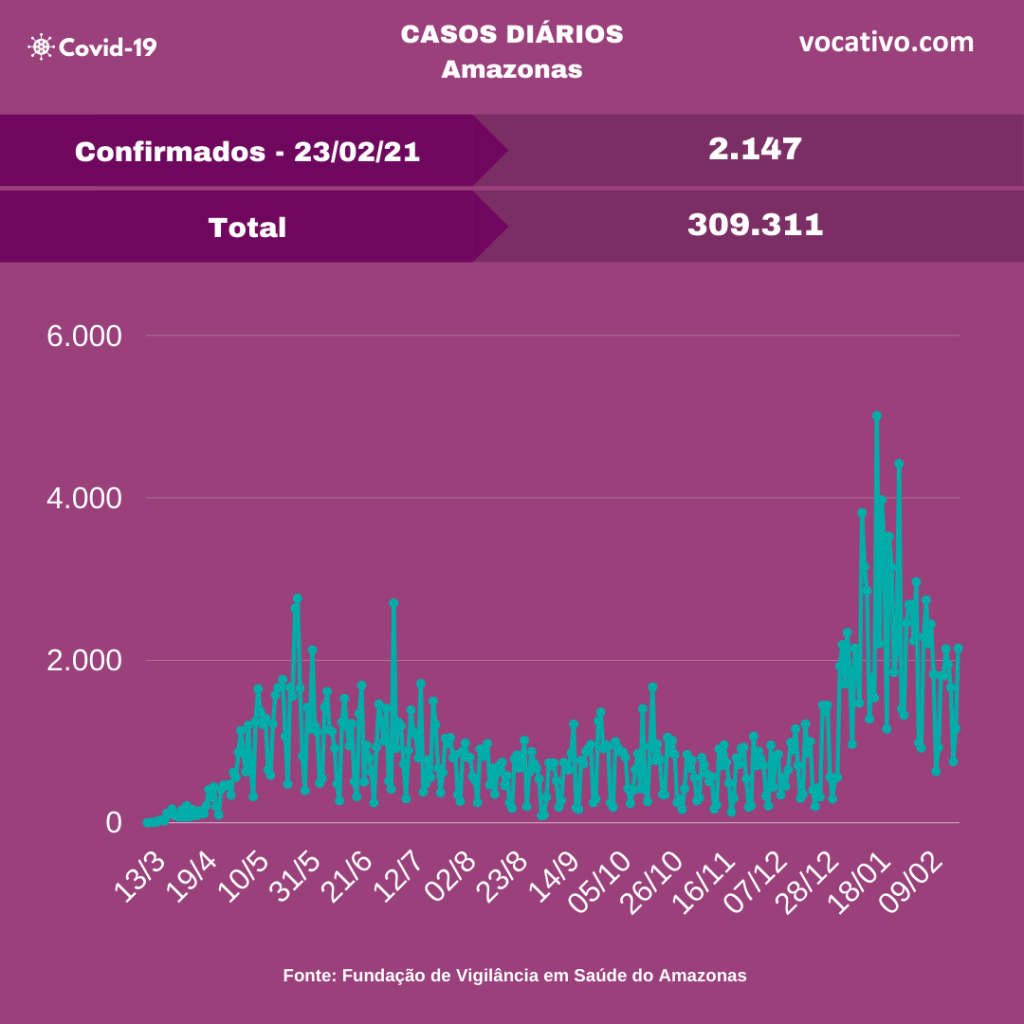 A Fundação de Vigilância em Saúde do Amazonas (FVS-AM) confirmou nesta terça-feira (23/02) o diagnóstico de 2.147 novos casos de Covid-19. Com isso, o total de casos da doença no estado chegou a 309.311, sendo 143.419 em Manaus (46,37%) e 165.892 do interior do estado (53,63%).
