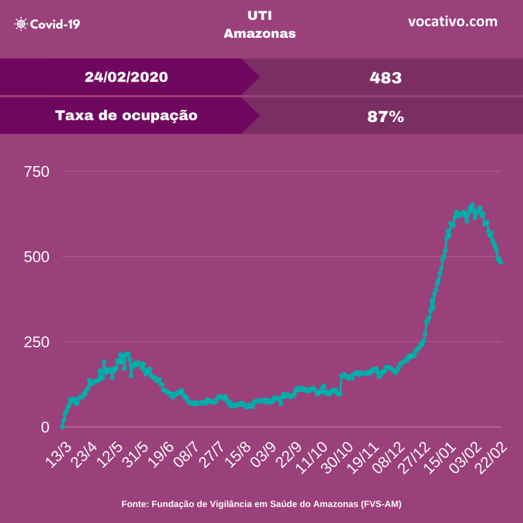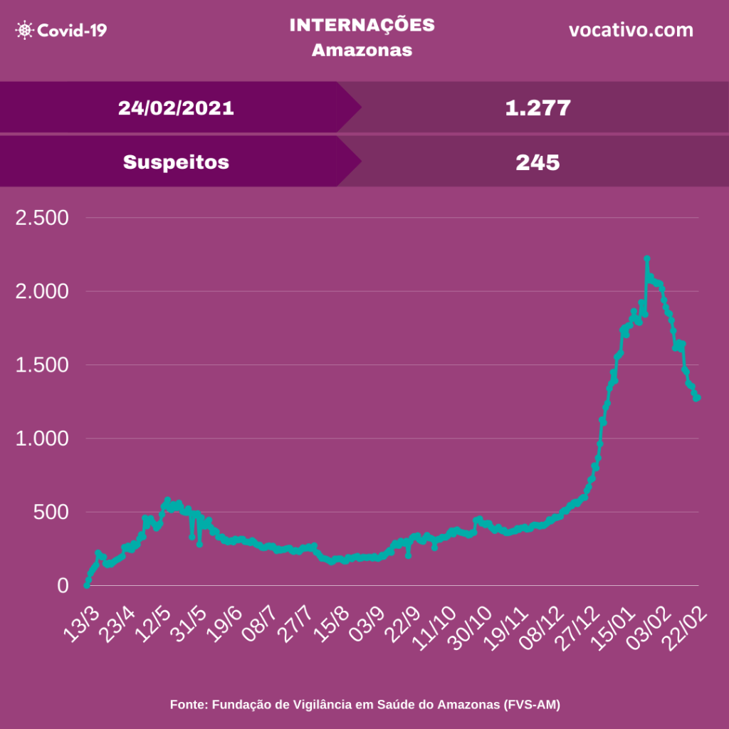 Óbitos – Segundo o boletim, foram confirmados 69 óbitos por Covid-19, sendo 32 ocorridos na terça-feira (23/02), e 37 óbitos foram encerrados por critérios clínicos, elevando para 10.642 o total de mortes (7.534 em Manaus e 3.108 no interior). A Prefeitura de Manaus registrou 87 sepultamentos nesta quarta, sendo 46 pelo novo coronavírus.
