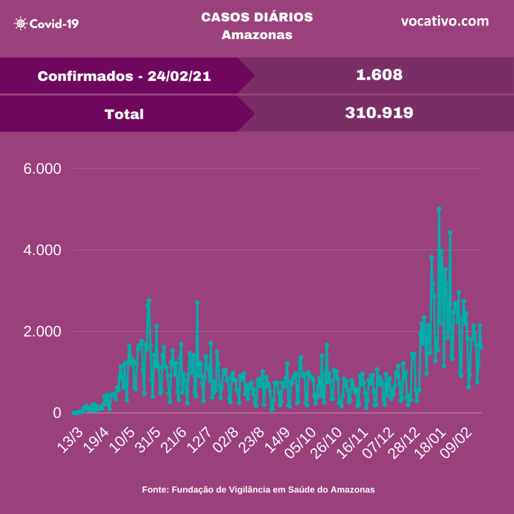 A Fundação de Vigilância em Saúde do Amazonas (FVS-AM) confirmou nesta quarta-feira (24/02) mais 1.608 casos de Covid-19. Com isso, o total é de 310.919 casos da doença no estado, sendo 144.162 de Manaus (46,37%) e 166.757 do interior do estado (53,63%).