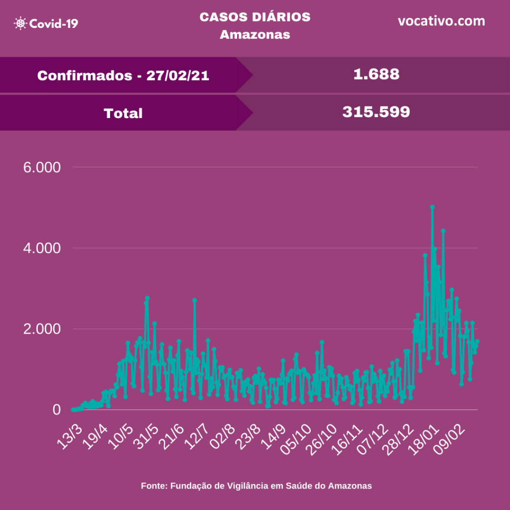 A Fundação de Vigilância em Saúde do Amazonas (FVS-AM) confirmou 1.688 novos casos de Covid-19 neste sábado (27/02), totalizando 315.599 casos da doença no estado. Destes, 146.235 são de Manaus (46,34%) e 169.364 do interior do estado (53,66%).