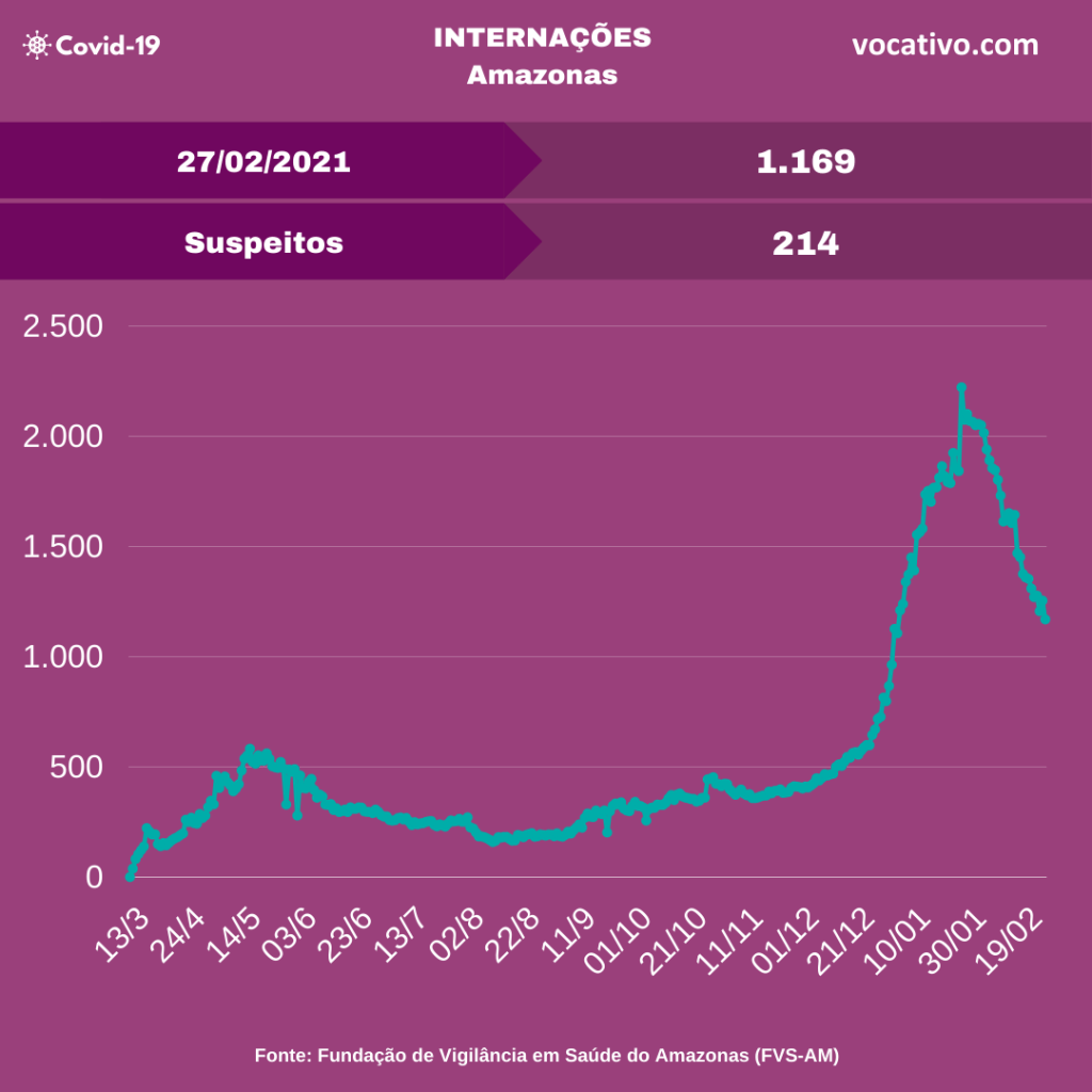 Óbitos – Foram confirmados 47 óbitos por Covid-19, sendo 31 ocorridos no dia 26/02 e 16 óbitos foram encerrados por critérios clínicos, de imagem, clínico-epidemiológico ou laboratorial, elevando para 10.831 o total de mortes (7.676 em Manaus e 3.155 no interior). A Prefeitura de Manaus registrou 64 sepultamentos nesta sábado, sendo 25 foram declaradas como Covid-19.