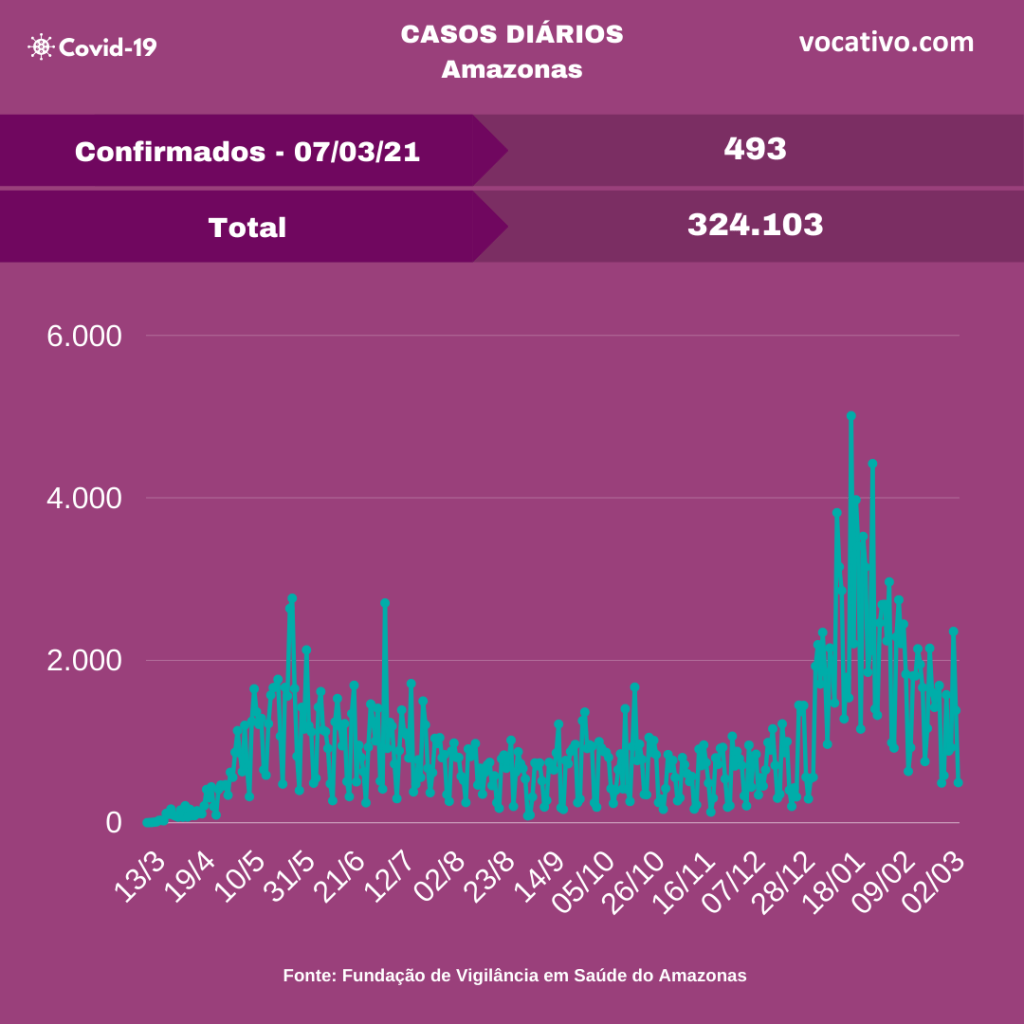 A Fundação de Vigilância em Saúde do Amazonas (FVS-AM) confirmou o registro de 493 novos casos de Covid-19 neste domingo (07/03), totalizando 324.103 casos da doença no estado. Do total, 150.035 são de Manaus (46,29%) e 174.068 do interior do estado (53,71%).