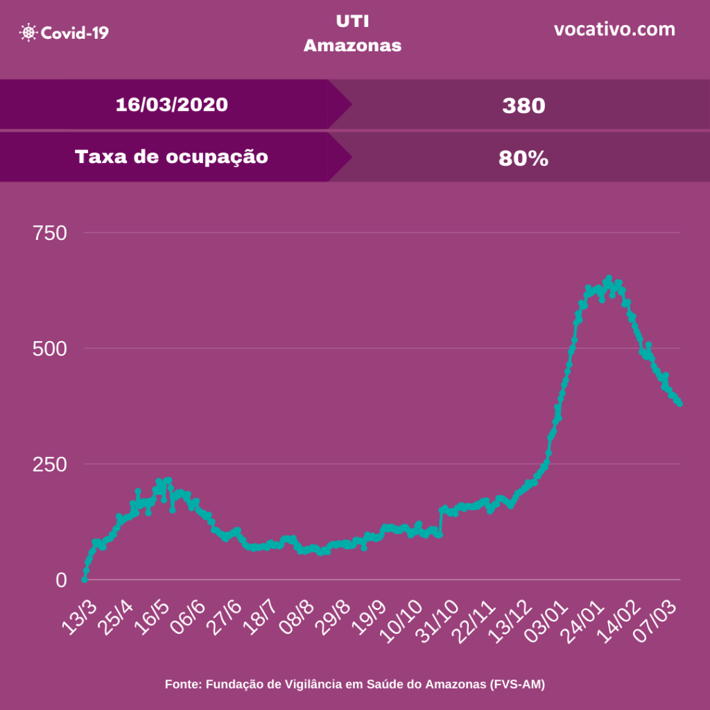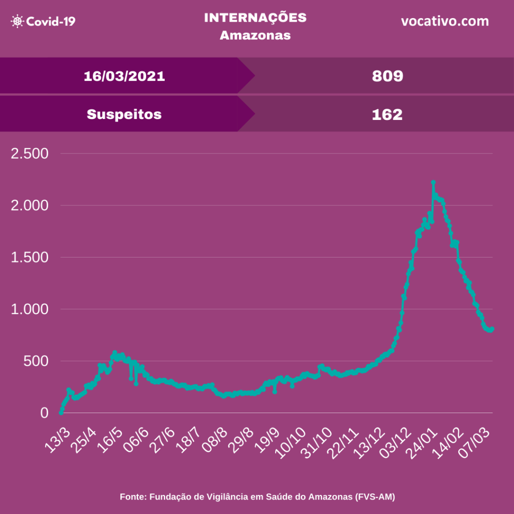 Óbitos – Foram confirmados 50 óbitos por Covid-19, sendo 13 ocorridos no dia 15/03 e 37 óbitos foram encerrados por critérios clínicos, elevando para 11.623 o total de mortes (8.231 em Manaus e 3.392 no interior). A Prefeitura de Manaus registrou 47 sepultamentos nesta terça-feira, sendo 17 como causa declarada a Covid-19.