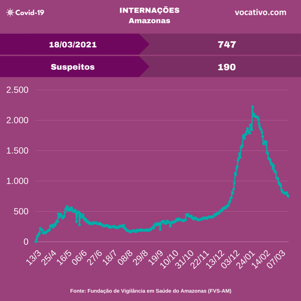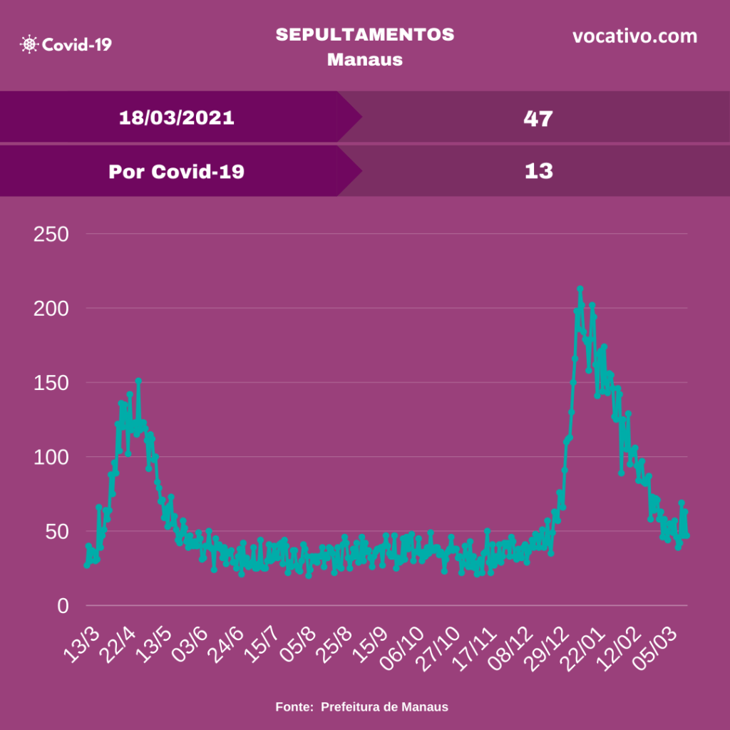 Óbitos – Foram confirmados 36 óbitos por Covid-19, sendo 22 ocorridos no dia 17/03 e 14 óbitos foram encerrados por critérios clínicos, elevando para 11.708 o total de mortes no Amazonas (8.278 em Manaus e 3.430 no interior). A Prefeitura de Manaus registrou 47 sepultamentos nesta quinta, sendo 13 foram declarados como Covid-19.