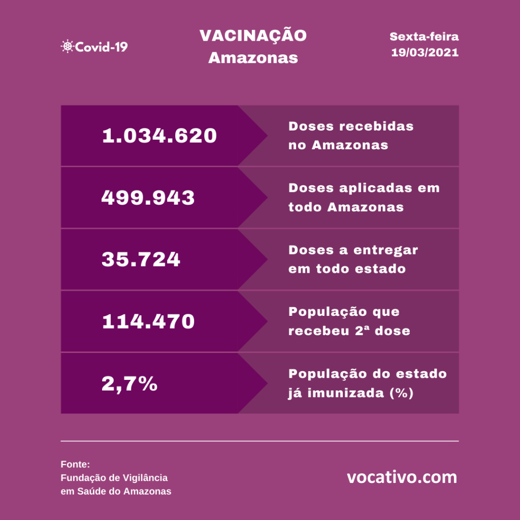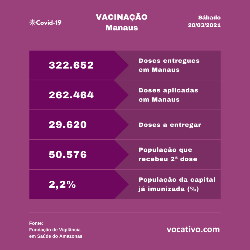 Vacinação – Dados parciais do Programa Nacional de Imunização (PNI), apontam que 499.943 doses de vacina foram aplicadas em todo o estado até este sábado, sendo 385.473 de primeira dose e 114.470 de segunda dose. Em Manaus, foram aplicadas 262.464 doses, sendo 211.888 da primeira e 50.576 da segunda.
