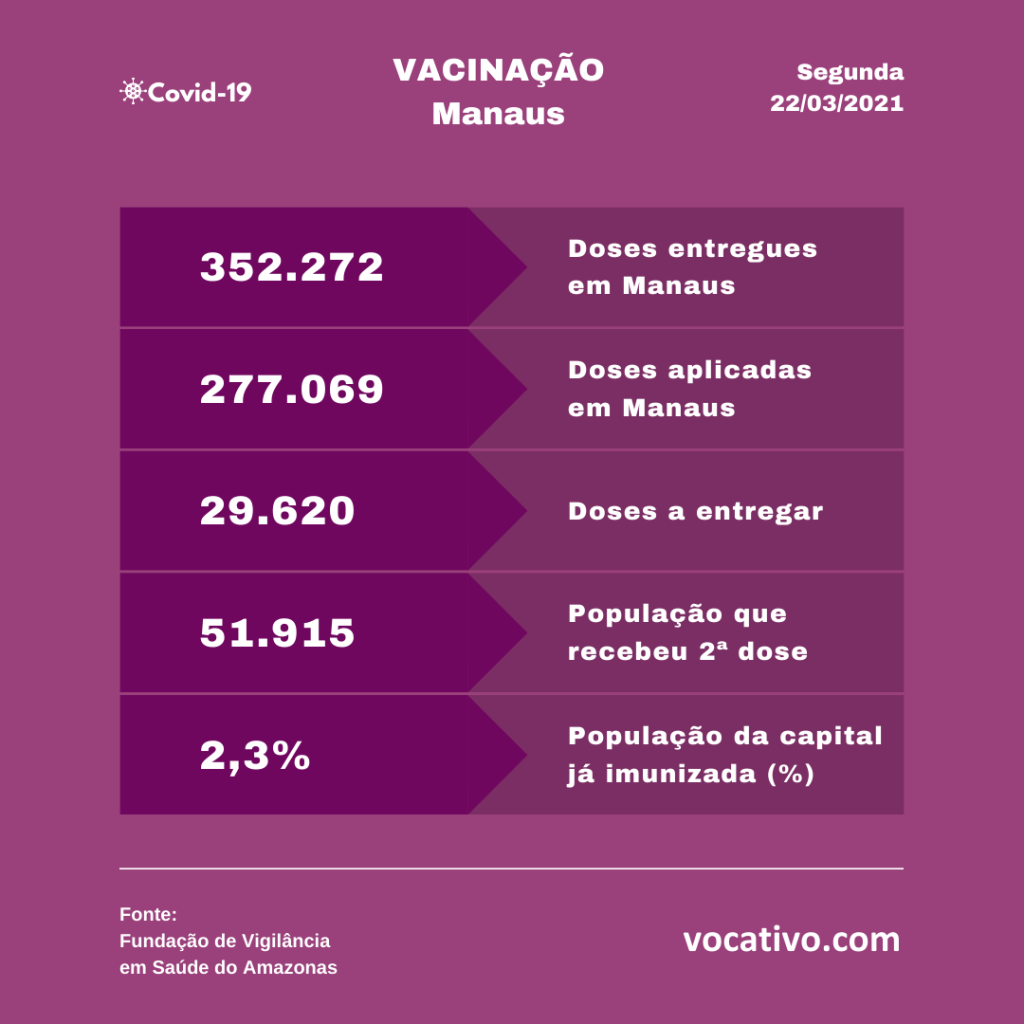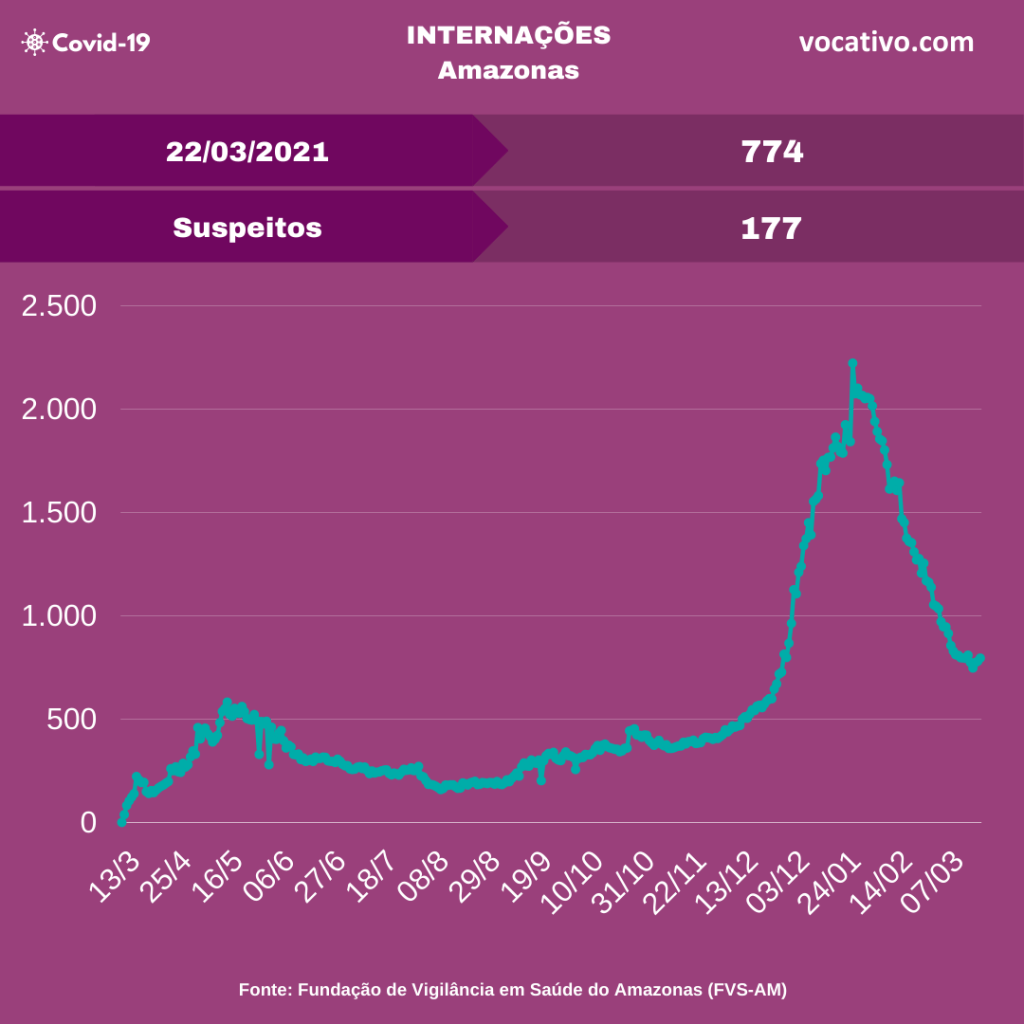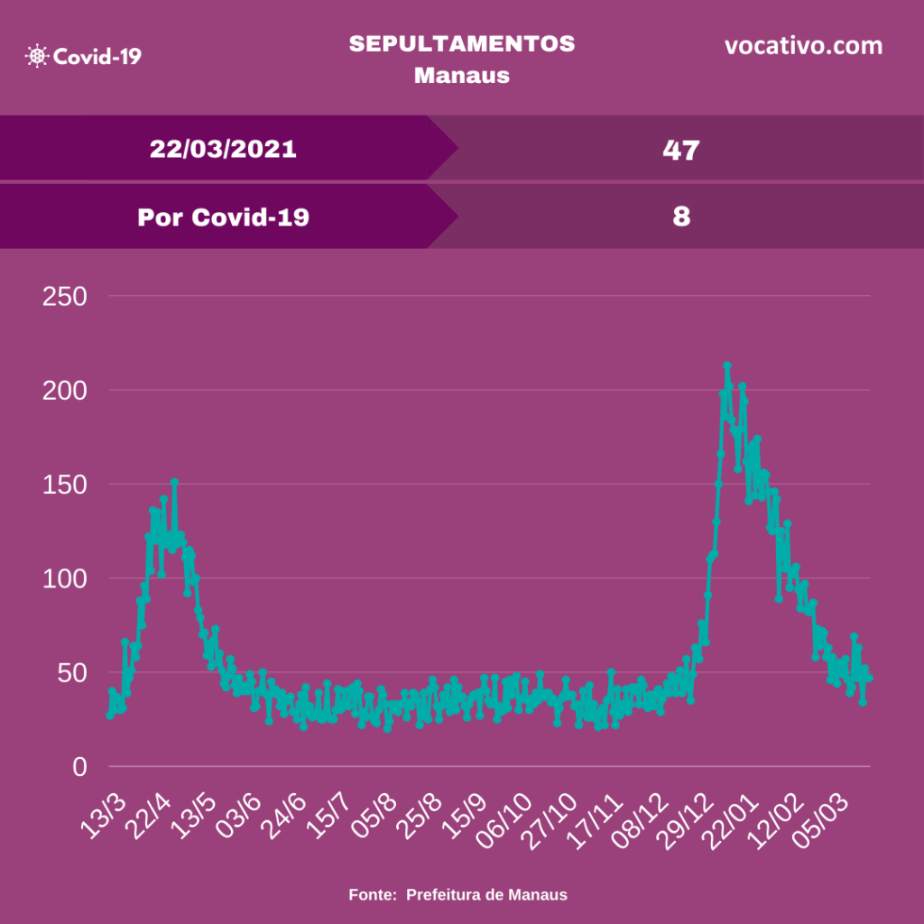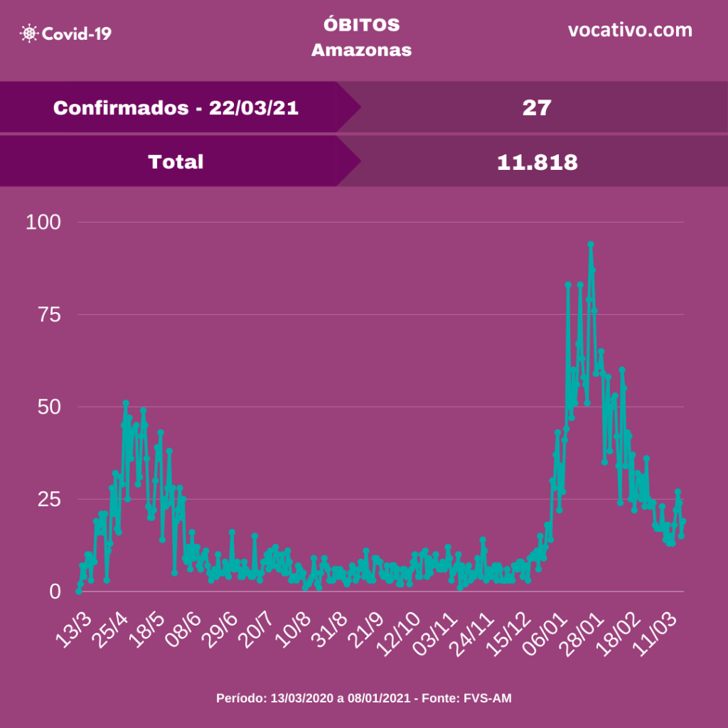 Óbitos – Foram confirmados ainda mais 27 óbitos por Covid-19, sendo 19 ocorridos no dia 21/03 e oito óbitos foram encerrados por critérios clínicos, elevando para 11.818 o total de mortes (8.342 em Manaus e 3.476 no interior). A Prefeitura de Manaus registrou 47 sepultamentos nesta segunda-feira, sendo 8 por Covid-19.