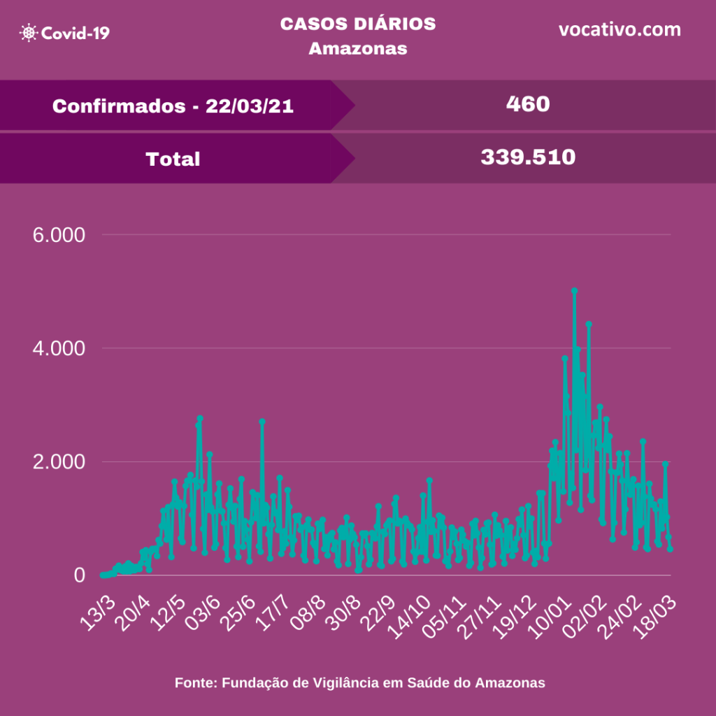 A Fundação de Vigilância em Saúde do Amazonas (FVS-AM) confirmou o registro de 460 novos casos de Covid-19, totalizando 339.510 casos da doença no estado nesta segunda-feira (22/03), sendo 156.350 de Manaus (46,05%) e 183.160 do interior do estado (53,95%).