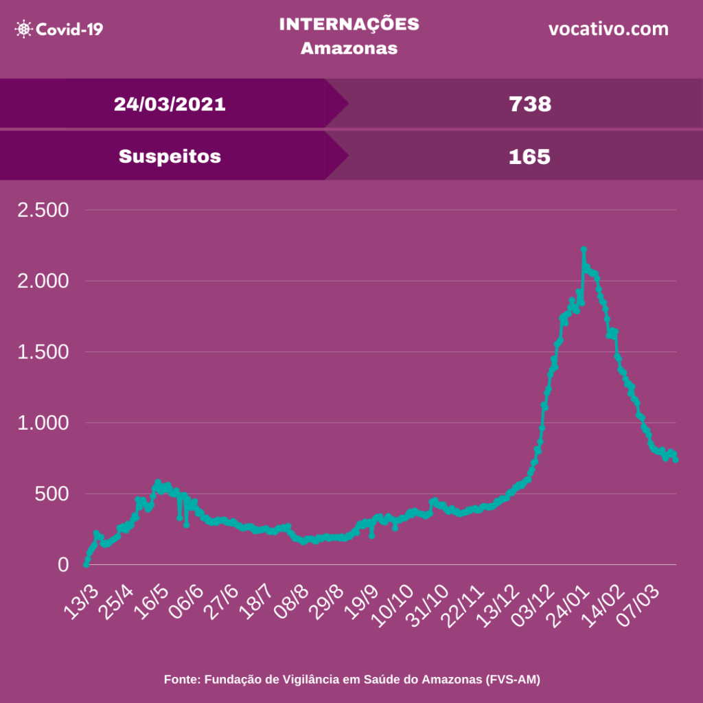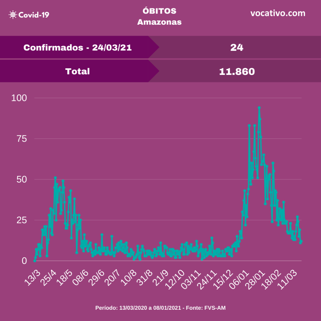 Óbitos – Foram confirmados mais 24 óbitos, sendo 12 ocorridos no dia 23/03 e 12 foram encerrados por critérios clínicos, elevando para 11.860 o total de mortes (8.356 em Manaus e 3.504 no interior). A Prefeitura de Manaus registrou 40 sepultamentos nesta quarta, sendo 12 declarados como Covid-19.