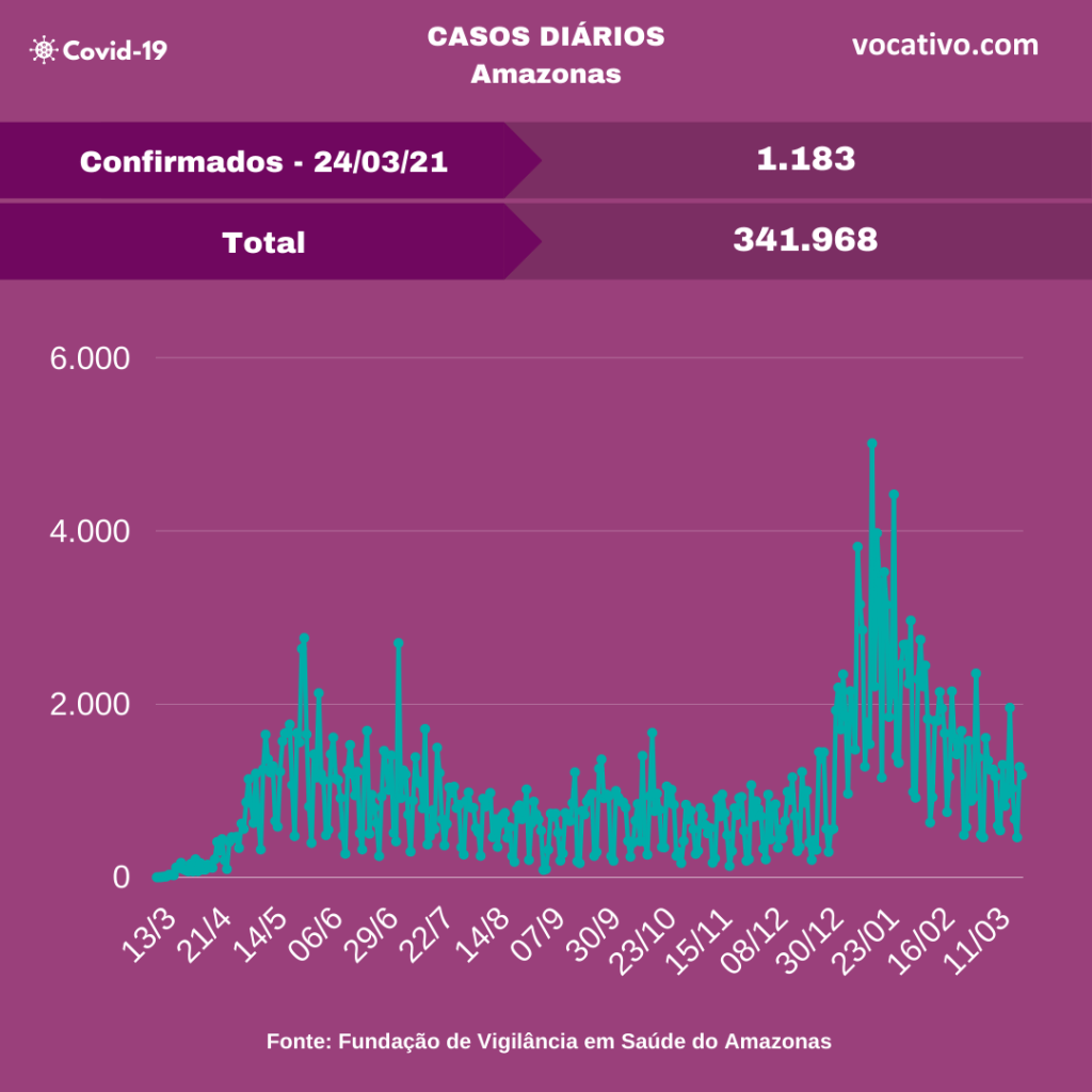 A Fundação de Vigilância em Saúde do Amazonas (FVS-AM) confirmou o registro de 1.183 novos casos de Covid-19, totalizando 341.968 casos da doença no estado nesta quarta-feira (24/03). Destes, 157.228 são de Manaus (45,98%) e 184.740 do interior do estado (54,02%).