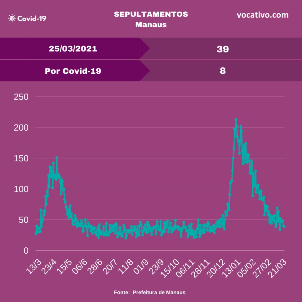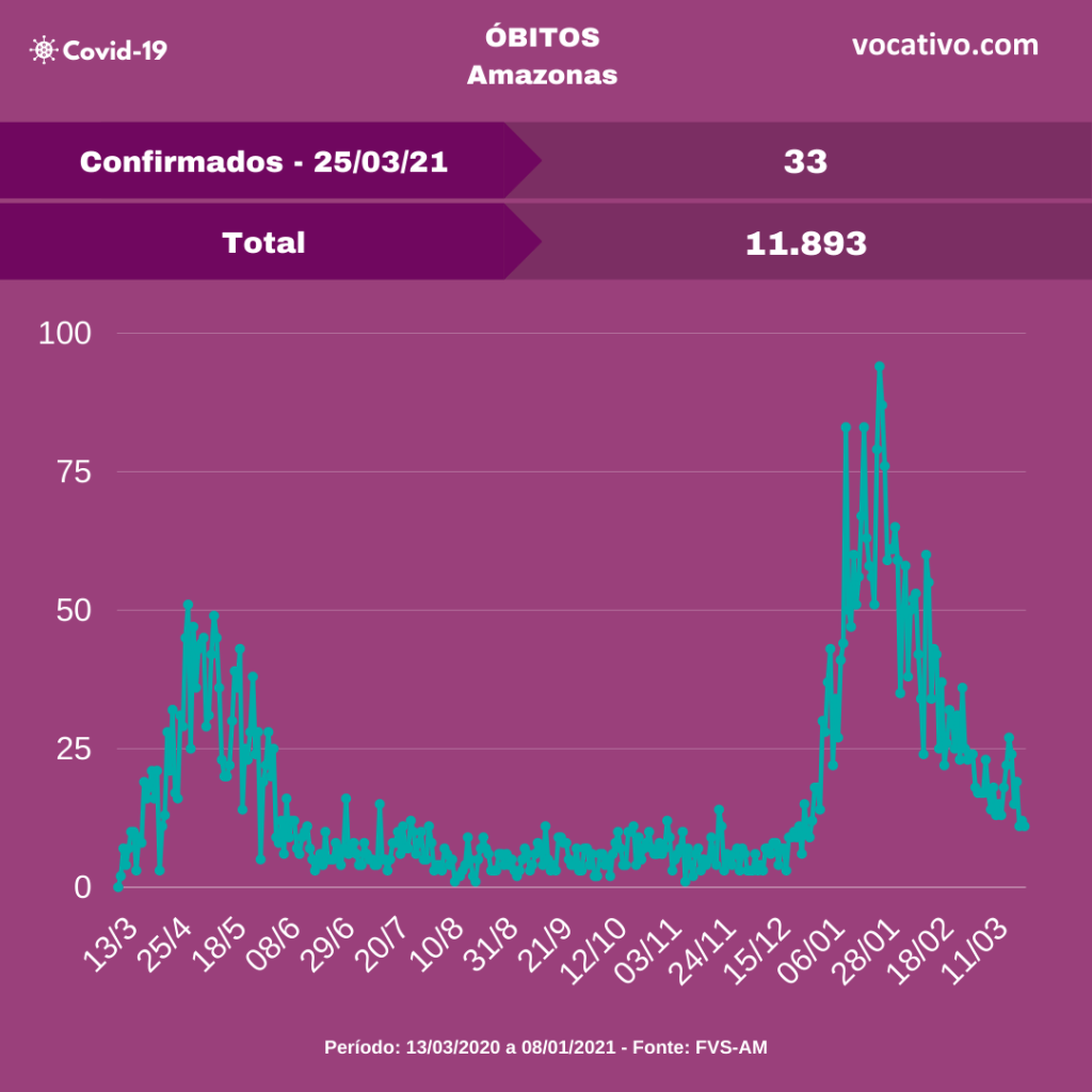 A Fundação de Vigilância em Saúde do Amazonas (FVS-AM) confirmou o registro de 1.165 novos casos de Covid-19, totalizando 343.133 casos da doença no estado nesta quinta-feira (25/03). Foram confirmados mais 33 óbitos por Covid-19, sendo 11 ocorridos no dia 24/03, elevando para 11.893 o total de mortes em todo estado, sendo 8.373 em Manaus e 3.520 no interior.