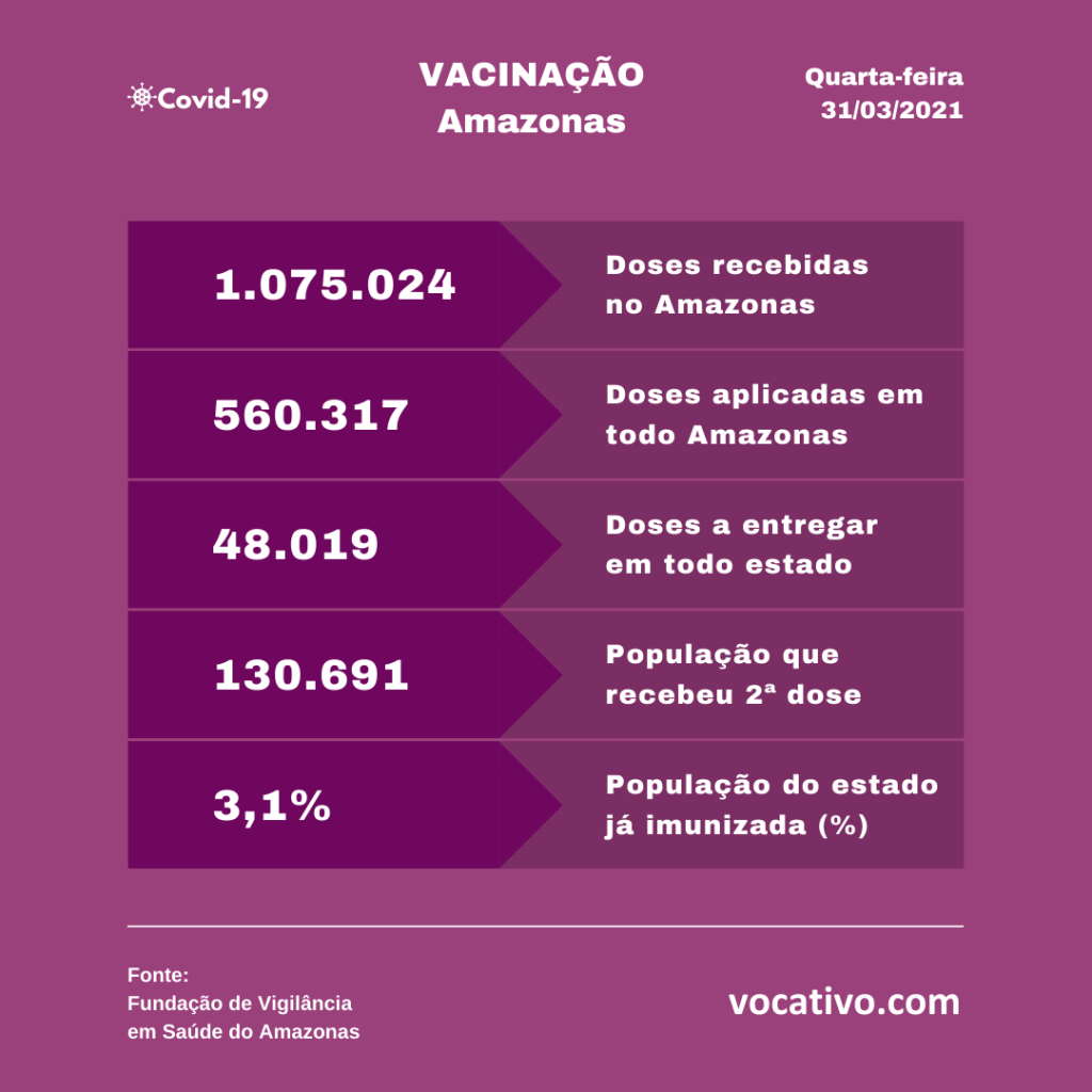 Segundo dados parciais do Programa Nacional de Imunização da FVS-AM (PNI/FVS-AM) foram aplicadas 560.317 doses de vacinas contra a Covid-19 em todo o estado até esta quarta, sendo 429.626 de primeira dose e 130.691 de segunda dose. Em Manaus, foram aplicadas 290.176 doses, sendo 235.087 de primeira e 55.089 de segunda.