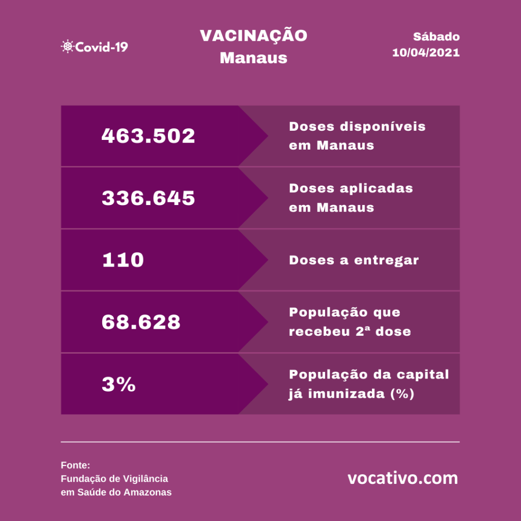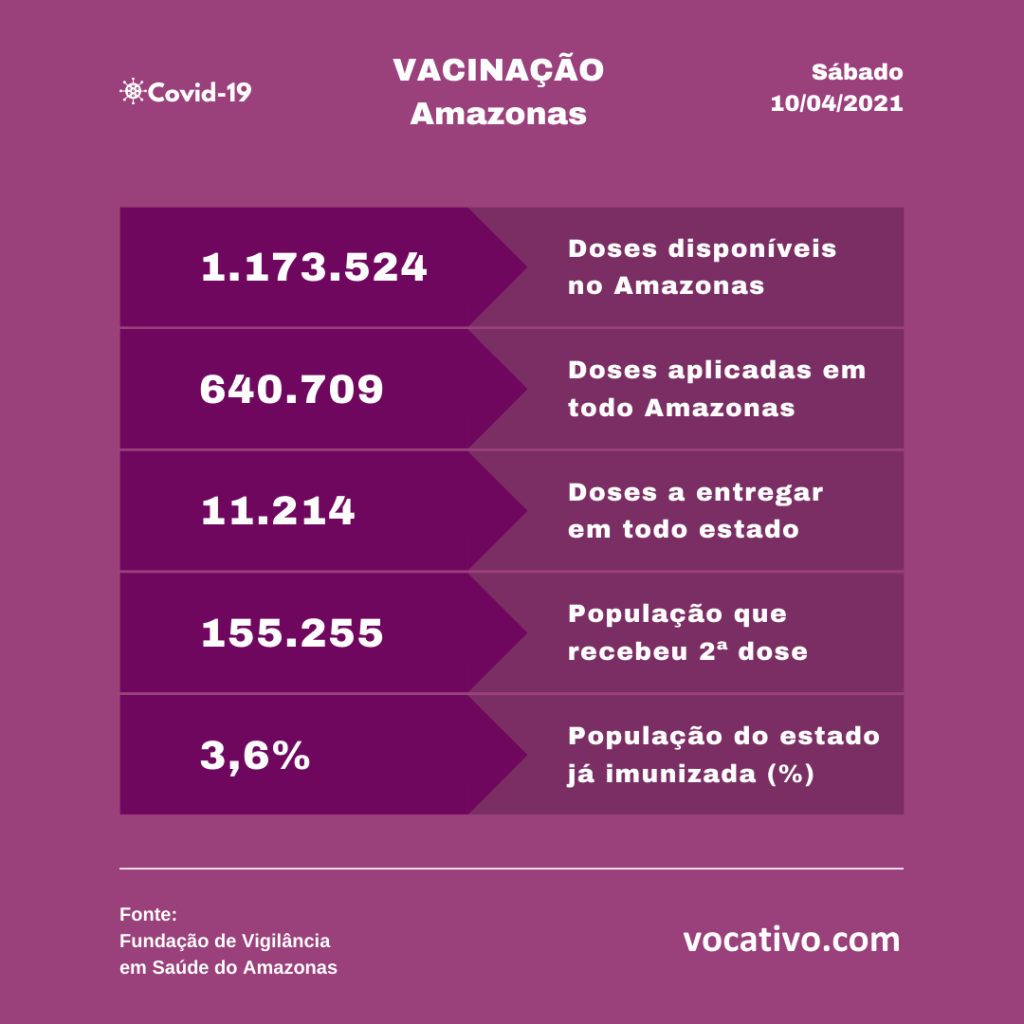A Fundação de Vigilância em Saúde do Amazonas (FVS-AM) confirmou o registro de 737 novos casos de Covid-19, totalizando 357.896 casos da doença no estado até este sábado (10/04). Foram confirmados mais 19 óbitos, sendo quatro ocorridos ontem, elevando para 12.245 o total de mortes.