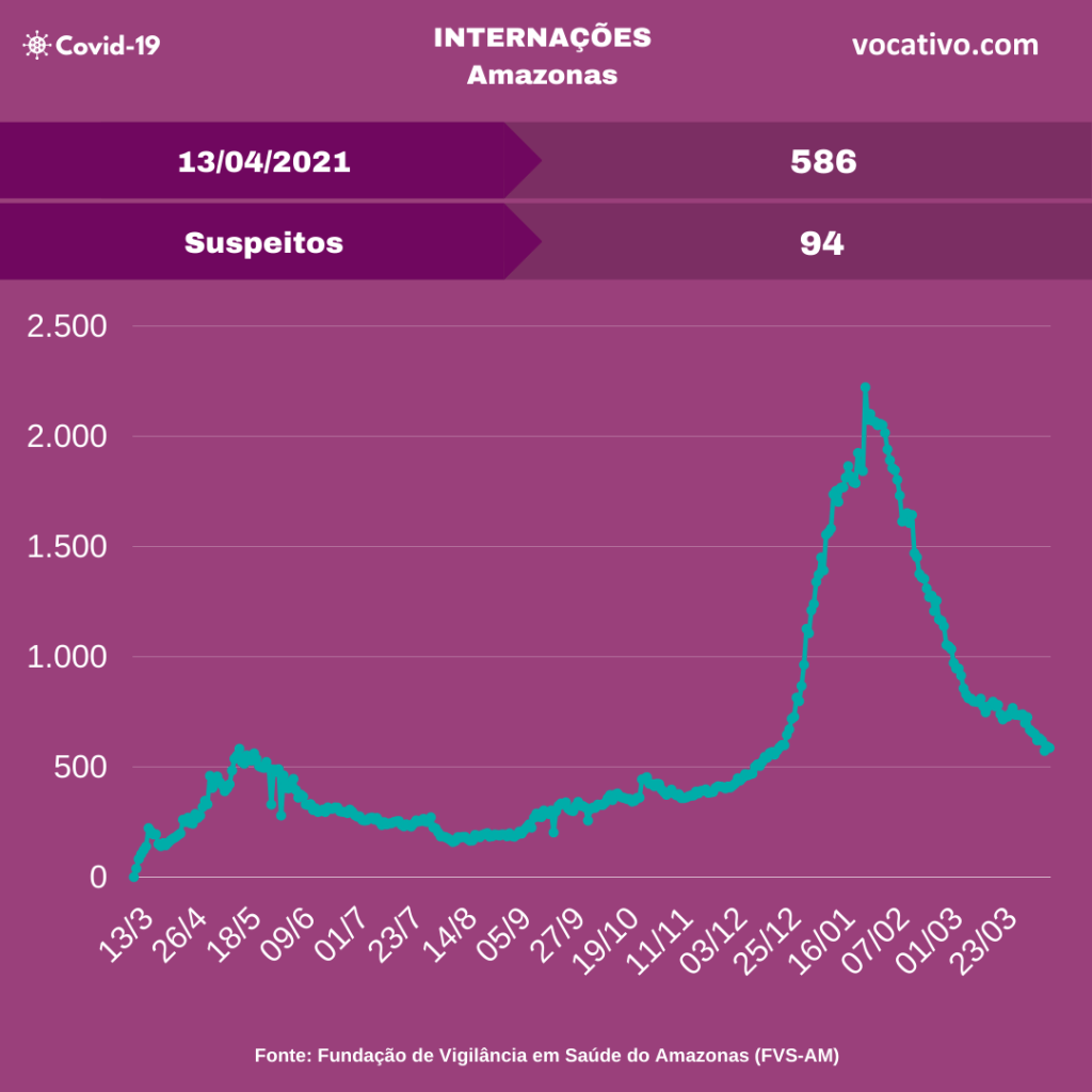 Entre os casos confirmados, há 586 pacientes internados em Manaus, sendo 258 em leitos, 319 em UTI e nove em sala vermelha. Há ainda outros 94 pacientes internados considerados suspeitos. Há outros 209 pacientes internados na rede pública de saúde do interior do estado. A taxa de ocupação de UTI’s é de 76%, sendo 83% na rede pública e 63% na rede particular.