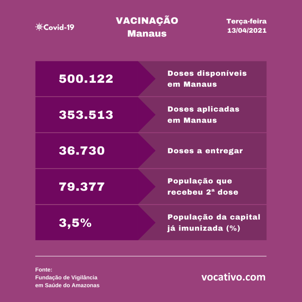 Dados parciais do Programa Nacional de Imunização (PNI) apontam que 672.991 doses foram aplicadas em todo o estado até esta terça, sendo 502.089 de primeira dose e 170.902 de segunda dose. Em Manaus foram aplicadas 353.513 doses, sendo 274.136 de primeira e 79.377 de segunda.