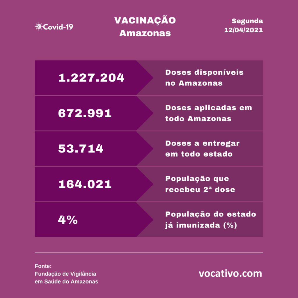 A Fundação de Vigilância em Saúde do Amazonas (FVS-AM) confirmou o registro de 995 novos casos de Covid-19, totalizando 359.915 casos da doença no estado até esta terça-feira (13/04). Foram confirmados mais 23 óbitos, sendo seis ocorridos no dia 12/04 e 17 óbitos foram encerrados por critérios clínicos, elevando para 12.294 o total de mortes.