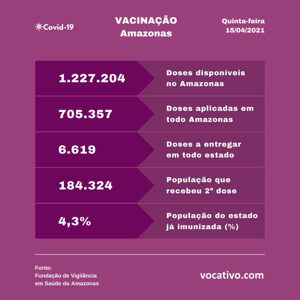 Dados parciais do Programa Nacional de Imunização (PNI), apontam que 705.357 doses foram aplicadas em todo o estado até esta quinta, sendo 521.033 de primeira dose e 184.324 de segunda dose. Em Manaus, foram aplicadas 369.161 doses, sendo X de primeira e X de segunda.