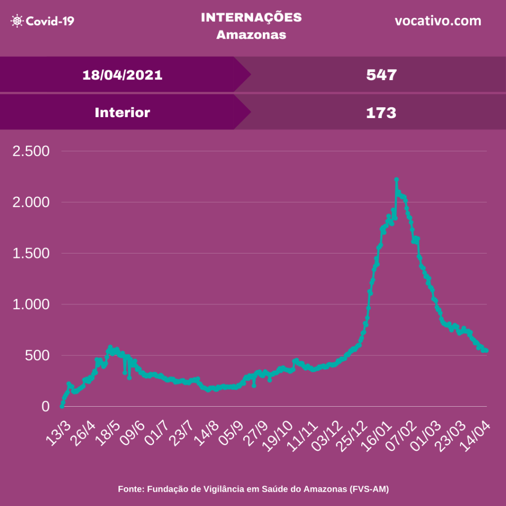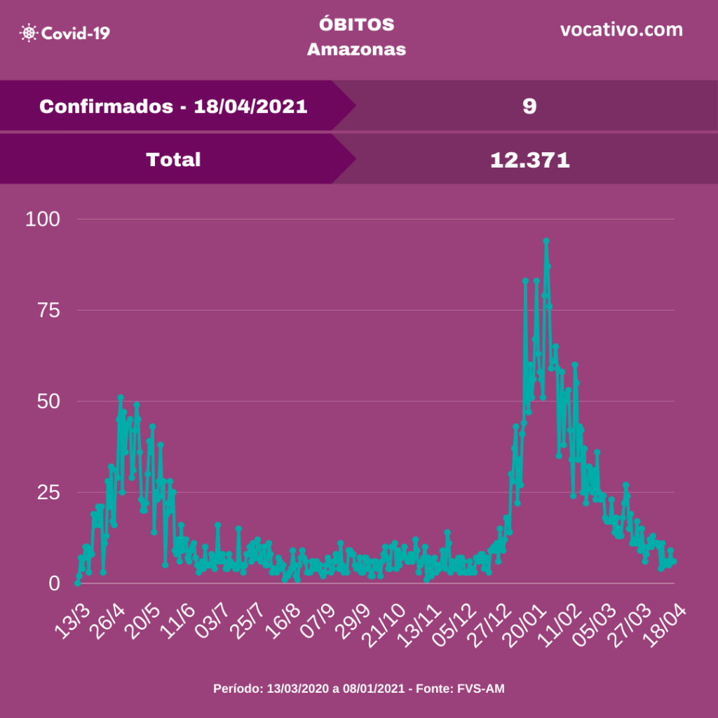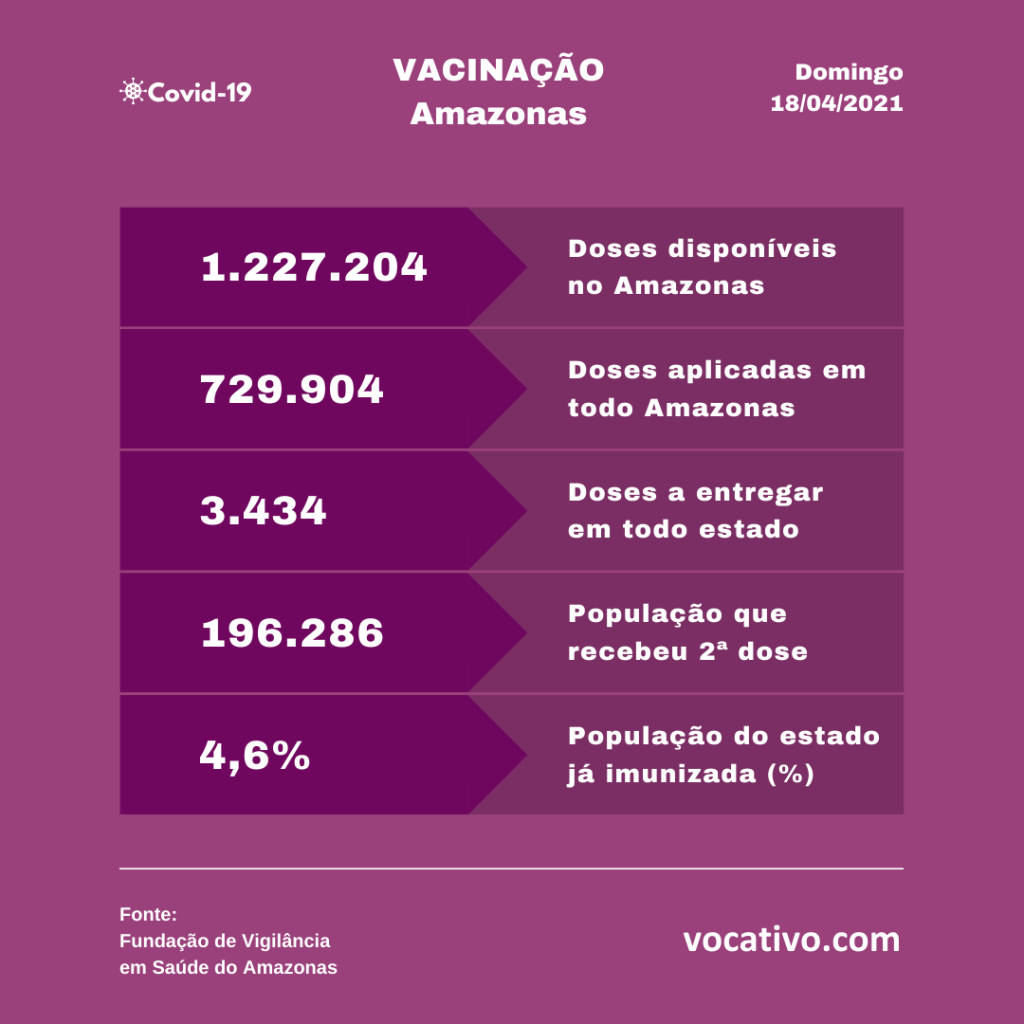A Fundação de Vigilância em Saúde do Amazonas (FVS-AM) confirmou o registro de 484 novos casos de Covid-19, totalizando 363.586 casos da doença no estado até este domingo (18/04). Foram confirmados mais nove óbitos, sendo seis ocorridos no dia 17/04 e três óbitos encerrados por critérios clínicos, elevando para 12.371 o total de mortes pela doença.