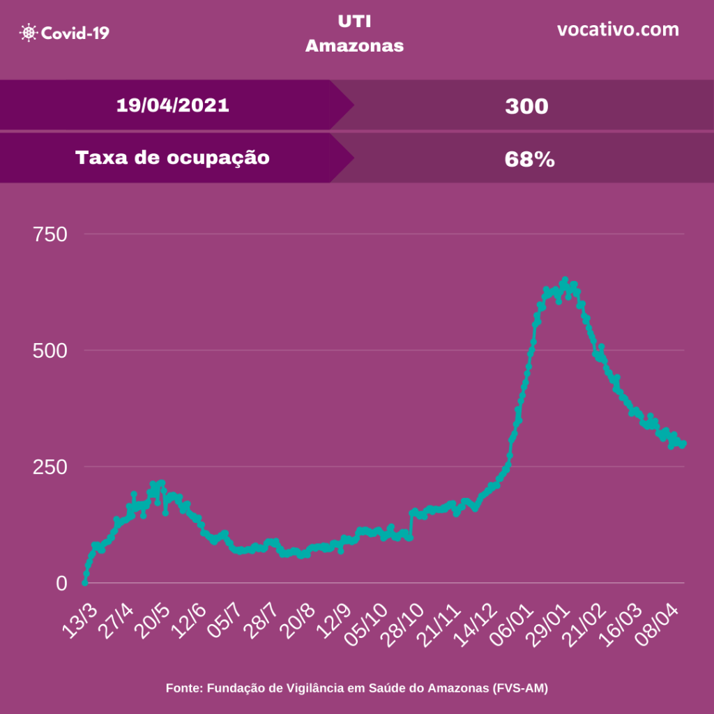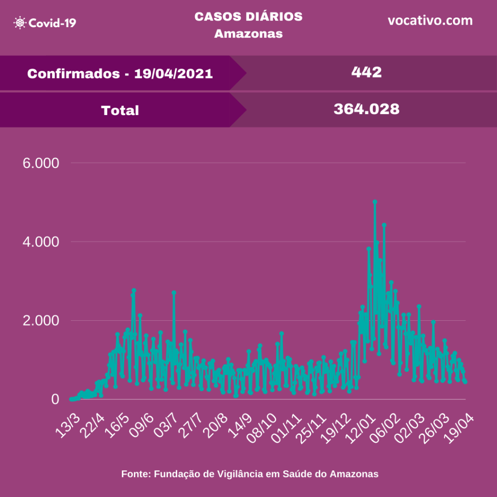 A Fundação de Vigilância em Saúde do Amazonas (FVS-AM) confirmou o registro de 442 novos casos de Covid-19, totalizando 364.028 casos da doença no estado até esta segunda-feira (19/04). Foram confirmados mais 25 óbitos por Covid-19, sendo oito ocorridos no dia 18/04 e 17 óbitos foram encerrados por critérios clínicos, elevando para 12.396 o total de mortes.