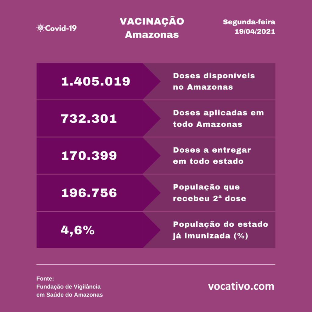 Dados parciais do Programa Nacional de Imunização (PNI) apontam que 732.301 doses foram aplicadas em todo o estado até esta segunda, sendo 535.545 de primeira dose e 196.756 de segunda dose. Em Manaus, foram aplicadas 383.640 doses, sendo 286.257 de primeira e 97.283 de segunda.