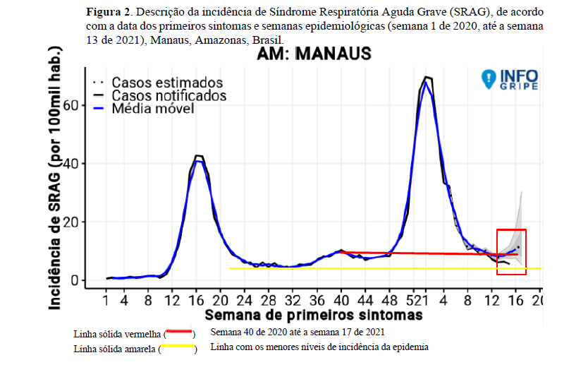 Segundo o boletim, a partir da semana entre os dias 21 a 27 de março de 2021, observa-se interrupção na queda da SRAG em Manaus e, a partir da semana entre os dias 04 a 10 de abril, há uma retomada de subida desses casos, padrão que se estende até a estimativa para a semana do último dia 01 de maio.